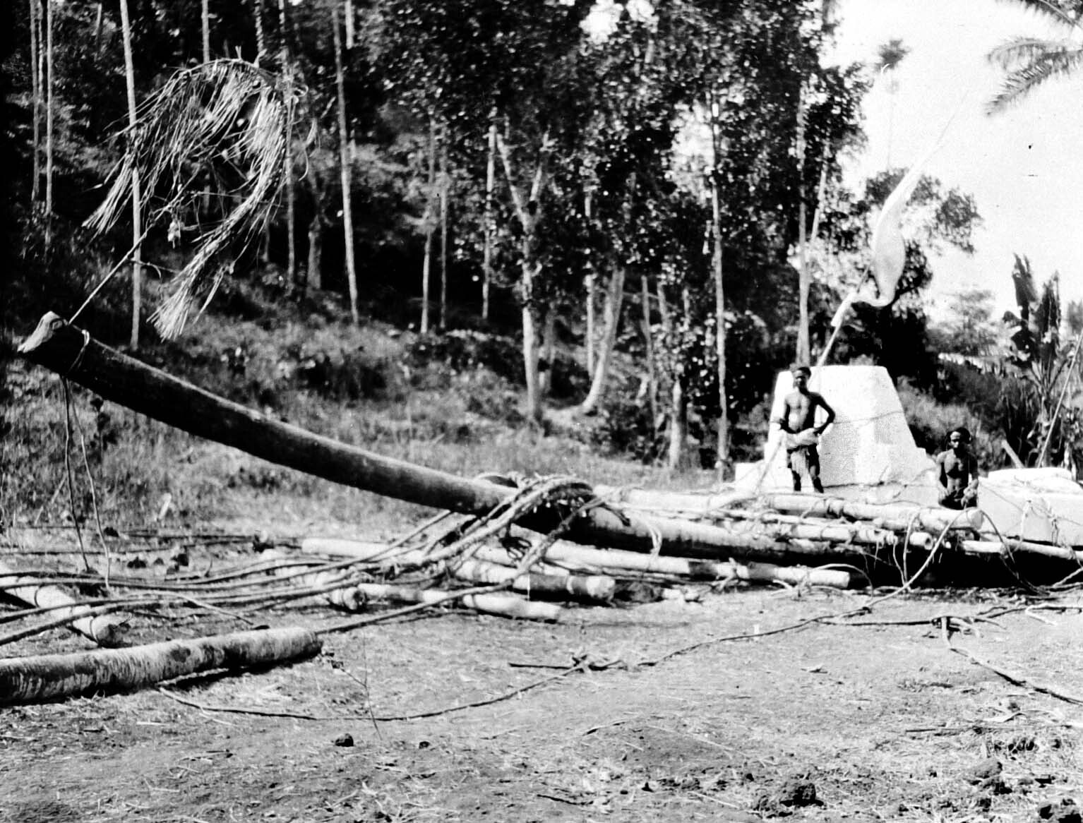 Met een slede van kokosboomstammen wordt een grafsteen gesleept, West-Sumba