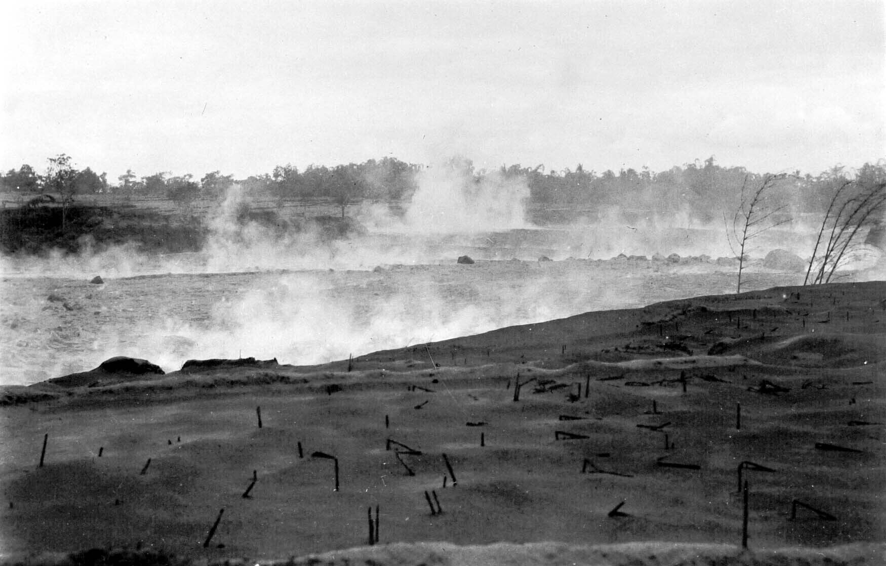 Doordat water en hete modderstroom zich mengen vormen er zich dampen boven het ravijn, dit als gevolg van de uitbarsting van de Merapi
