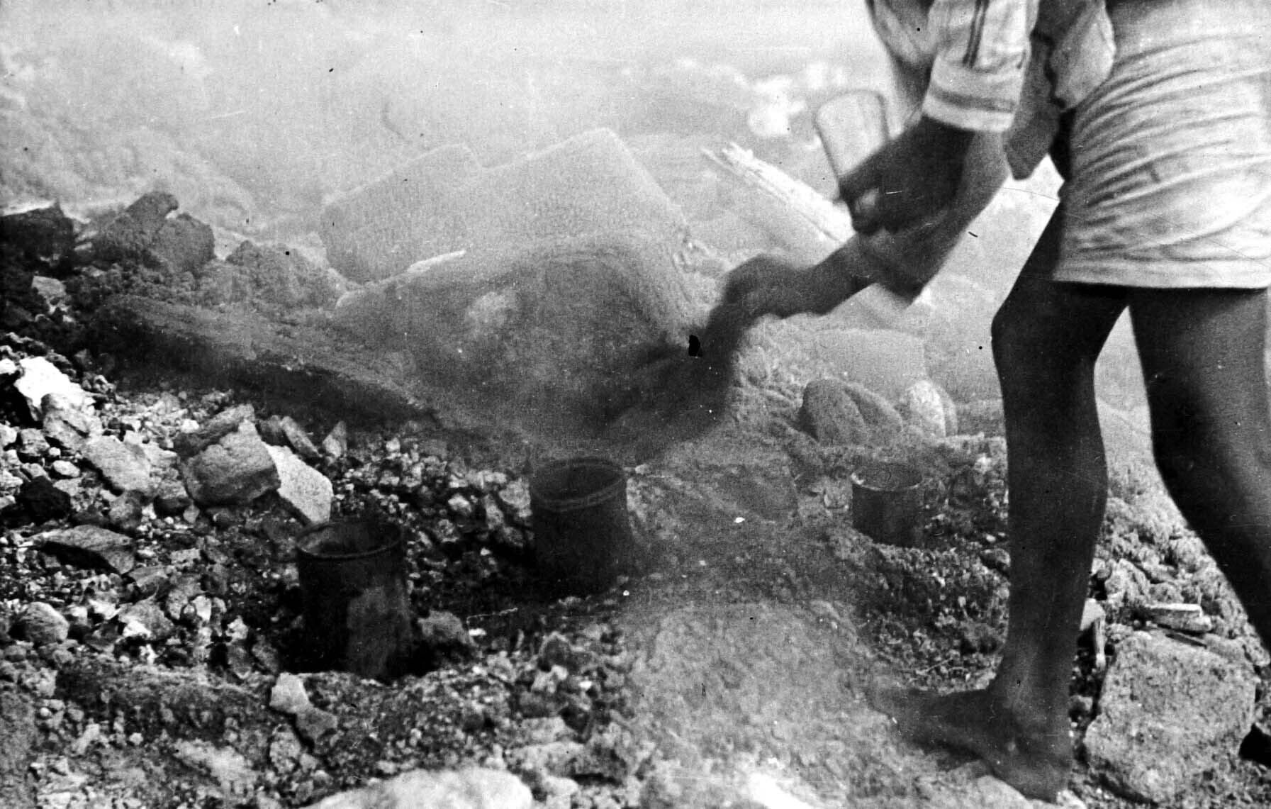 Blikjes met zwavelmodder worden gezet in de krater van de Papandajan