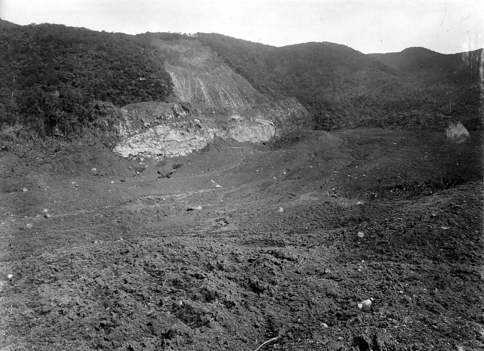 Aardstorting op de helling van de vulkaan Goenoeng Goentoer bij Garoet, West-Java, gezien van de eindwal richting de oorsprong
