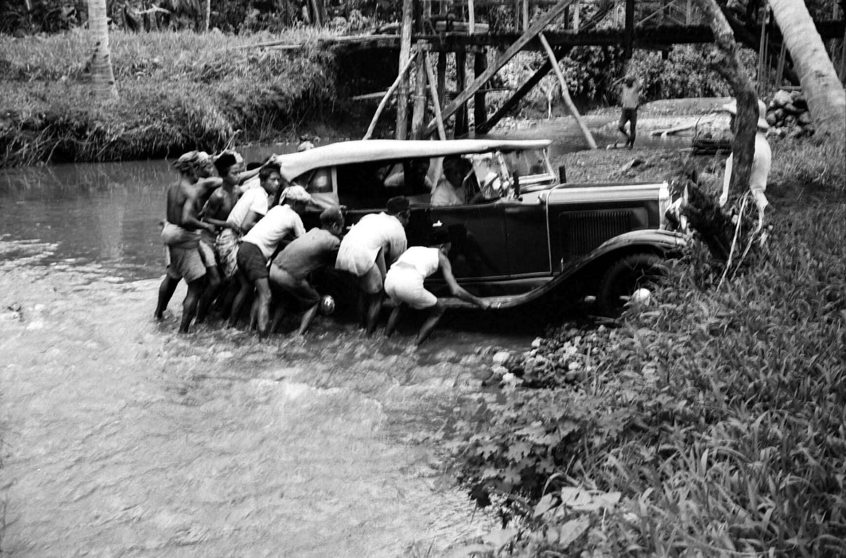 De auto van een bestuursambtenaar moet door de rivier worden getrokken en op een ondiepe en niet te stenige plaats op de oever aan de overkant worden geduwd omdat de houten brug door een overstroming is weggeslagen, Mamudju, Mandar, Celebes