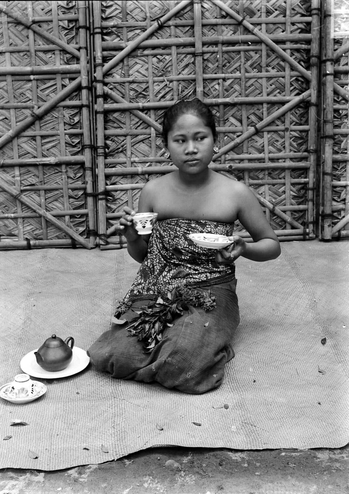 De vrouw van de gudang mandur, een soort marktopzichter, drinkt thee uit Boerenbont-servies