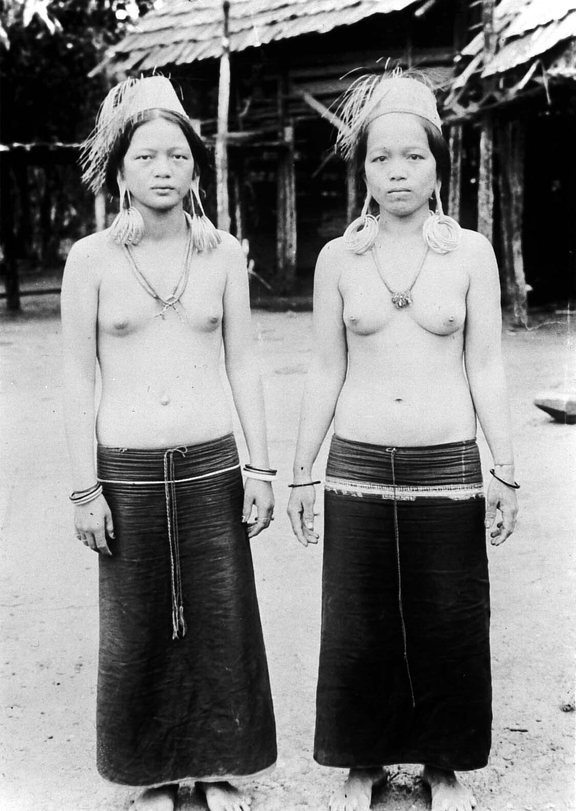 Jonge Kayan vrouwen in huiskleding, Midden-Oost-Borneo