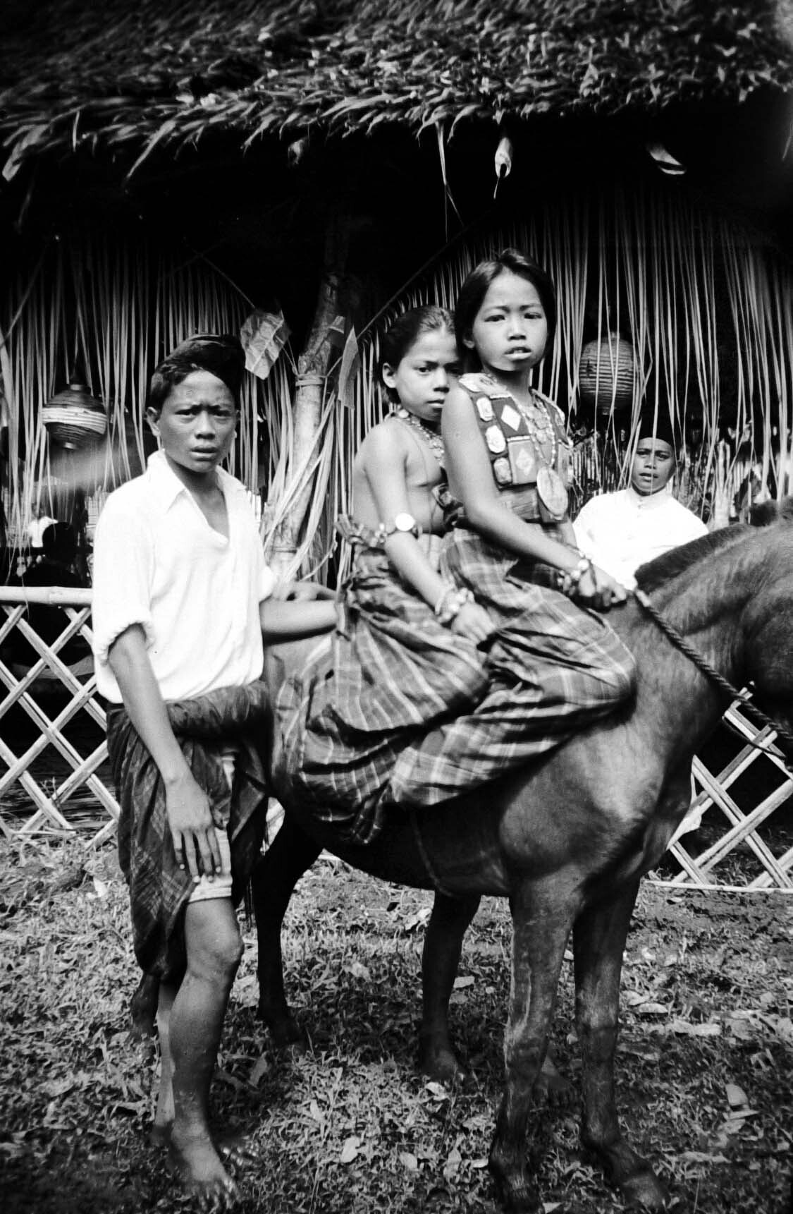 Meisjes in feestkleding gaan, om geen moddervoeten te krijgen, te paard naar een adatfeest