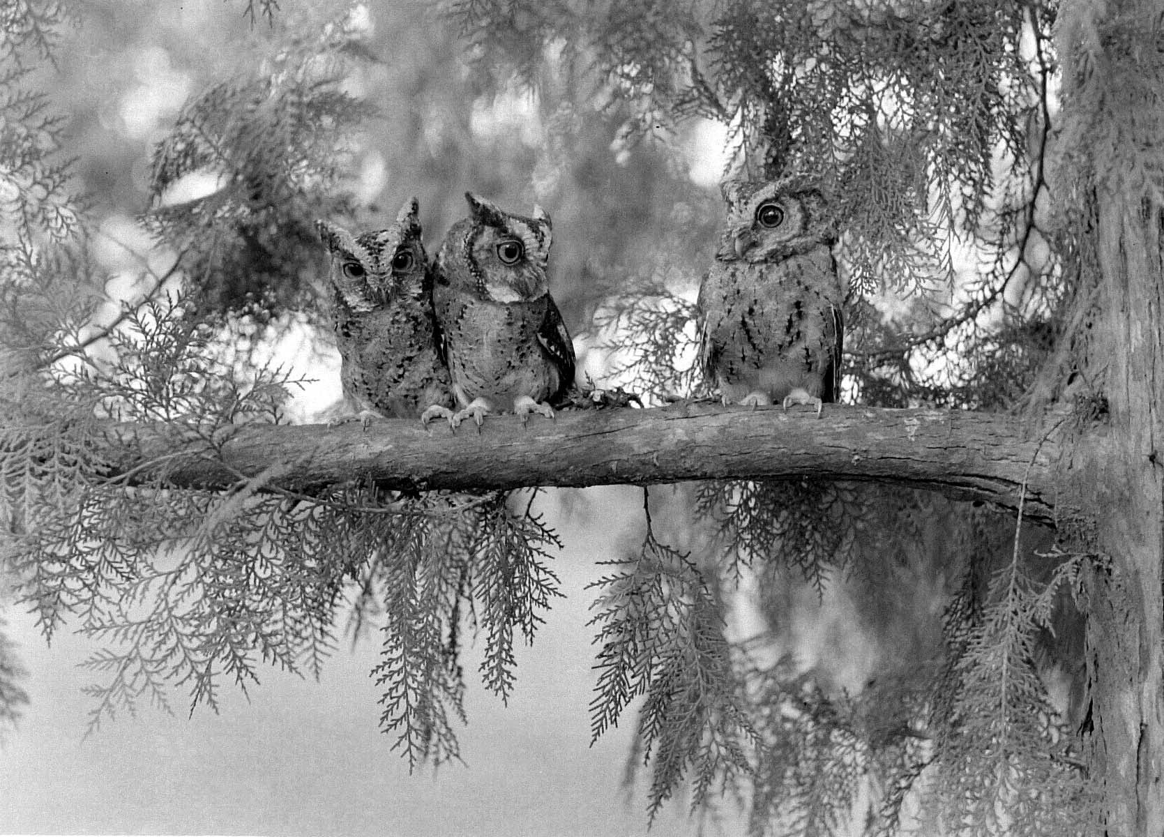 Een Maleise dwerg-ooruil (Otus bakkamoena lempiji) met twee jongen, Dampar, Oost-Java