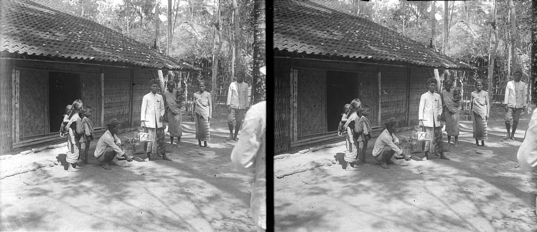 Een man haalt en bekijkt rattenvallen in de kampong te Bandjaratmo bij Pekalongan, Midden-Java
