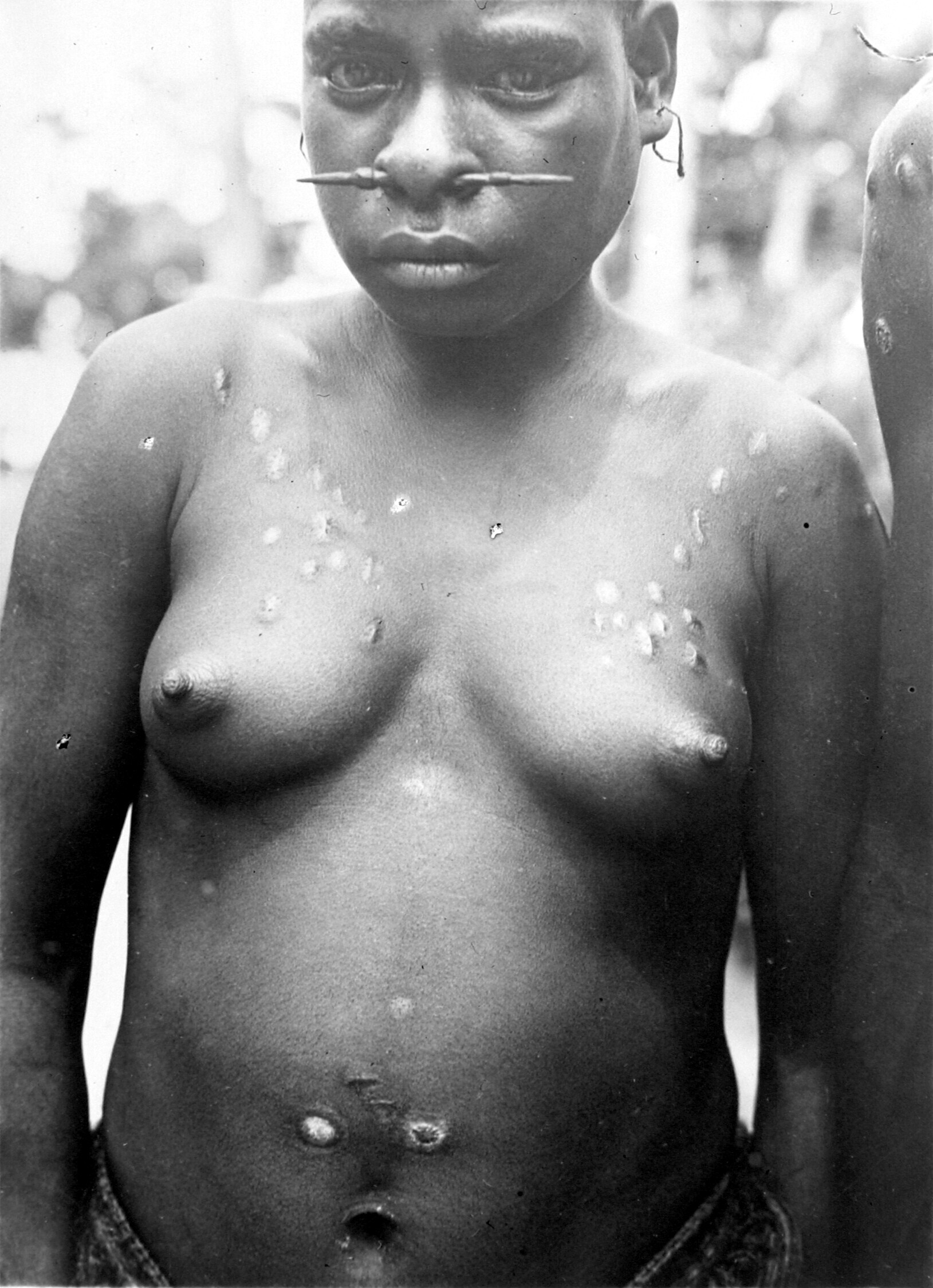 Een Aika-vrouw met brandversieringen