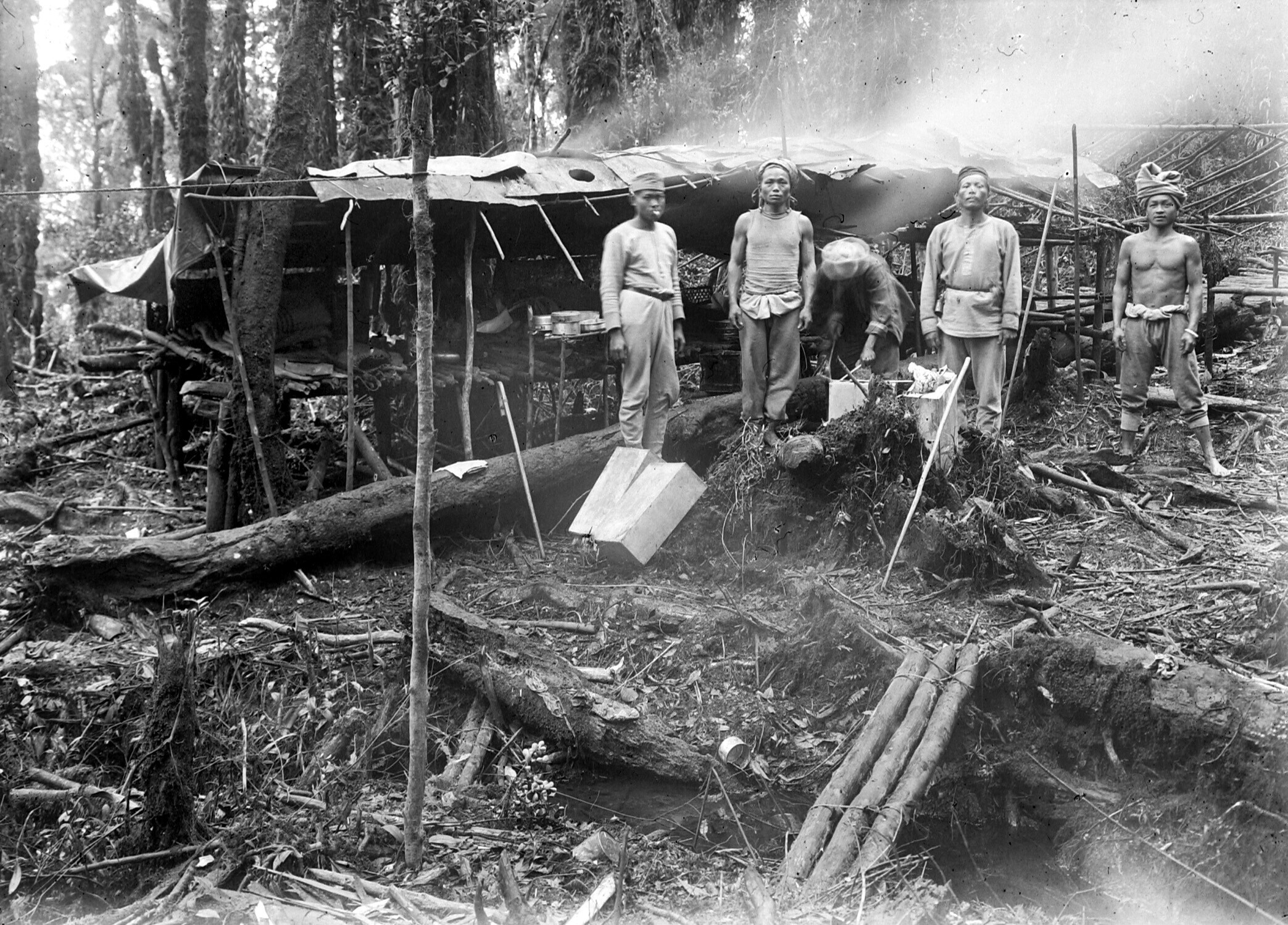Centr. N.Guinee Exp. 1920. Beekbivak; mantri, jongen en 3 Dajaks.