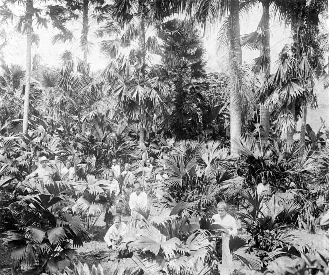 Arbeiders aan het werk tussen Carludovica palmata