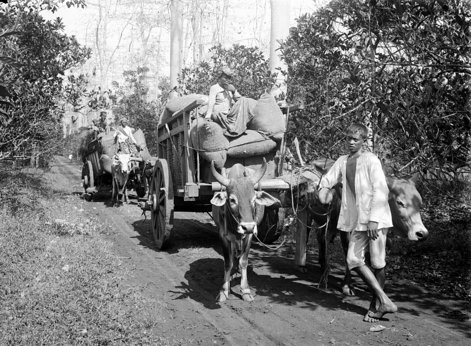 Plukkers vervoeren de geoogste ruwe kapok per kar (grobak) naar de fabriek, vermoedelijk van onderneming Siloewok Sawangan te Pekalongan, Midden-Java