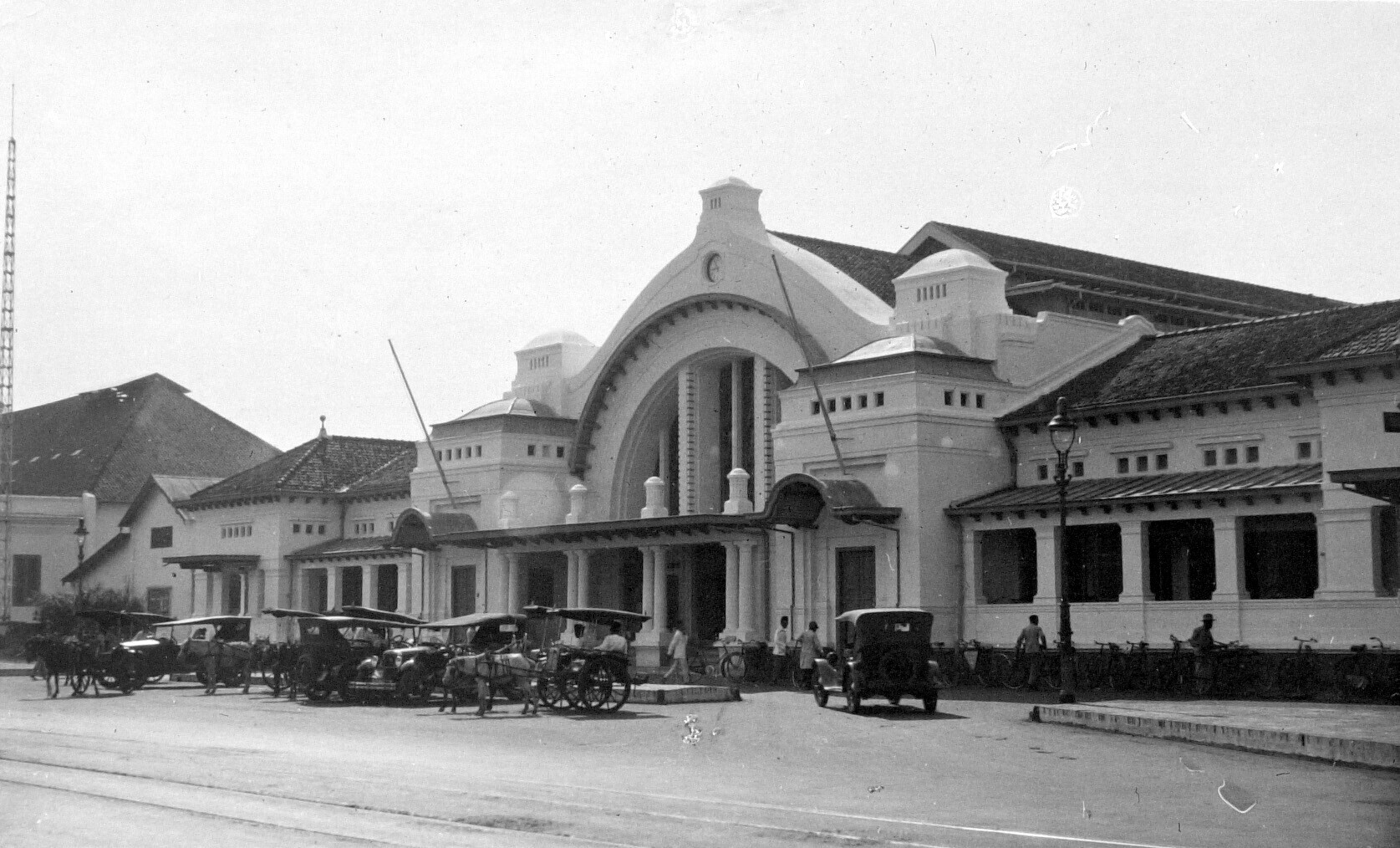 Geparkeerde auto's en rijtuigen voor het post- en telegraafkantoor in Weltevreden, Batavia