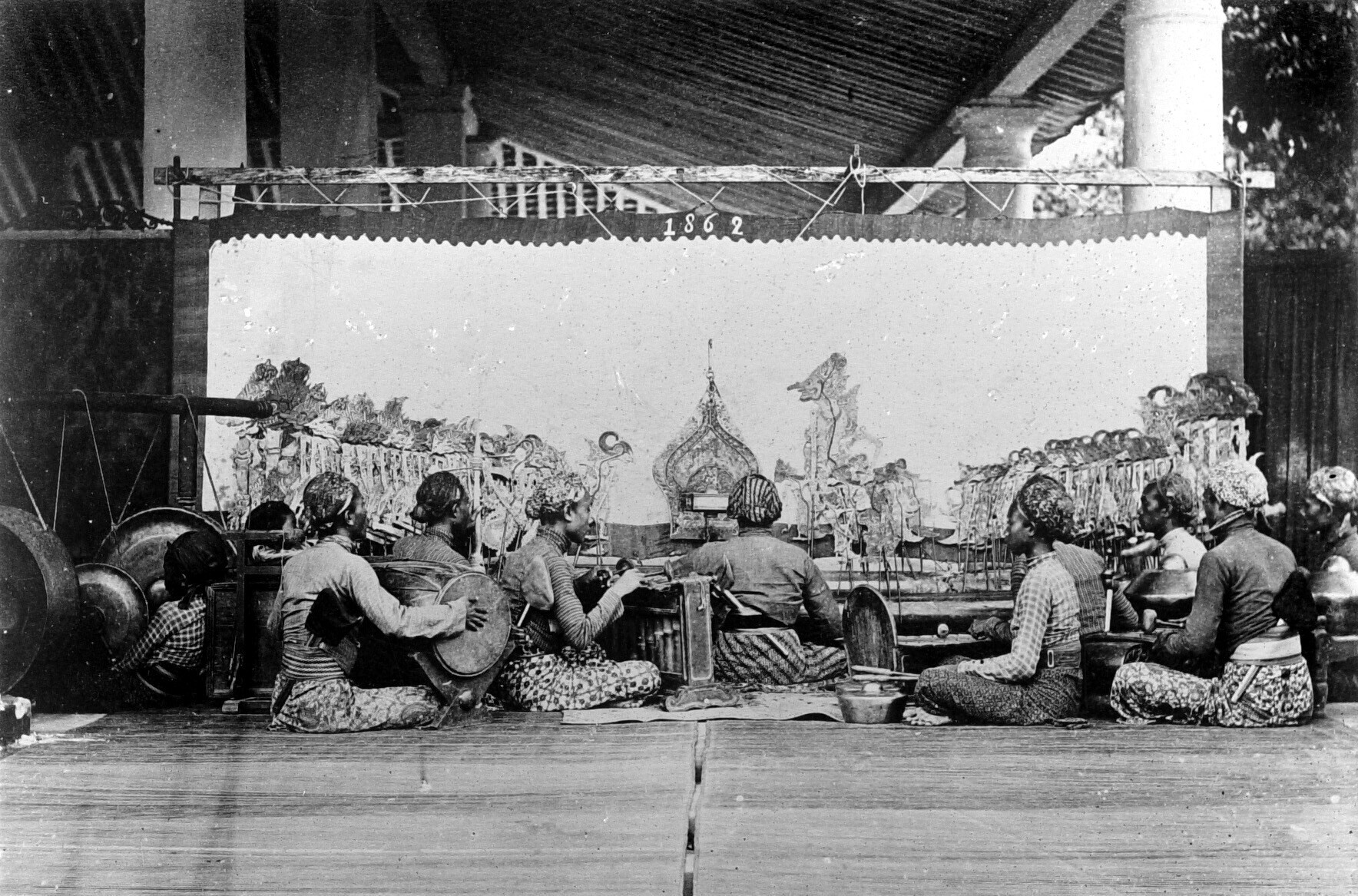 A wayang kulit performance accompanied by a gamelan orchestra