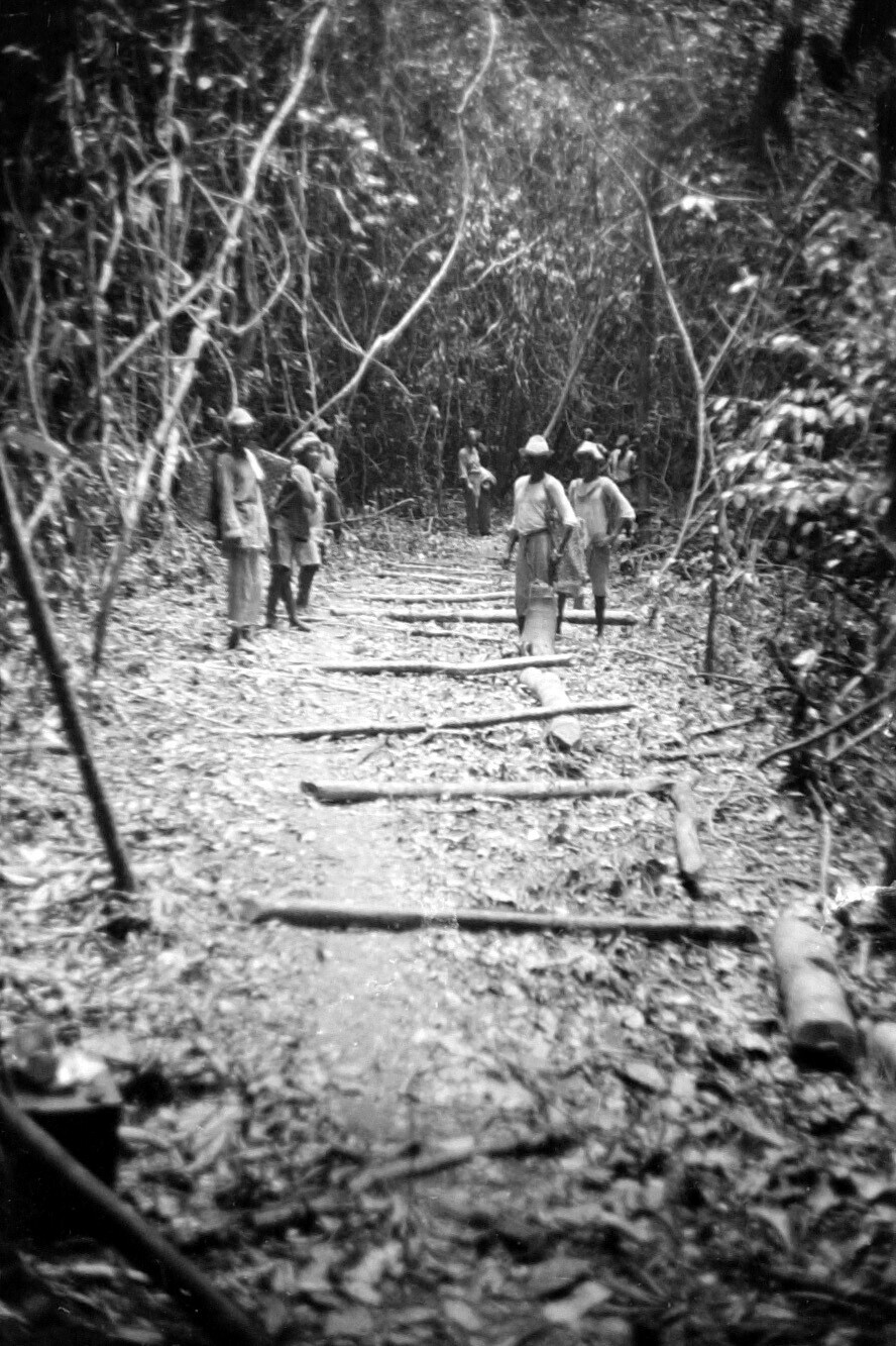 Pad door de bossen met rolhouten om de boten te vervoeren.