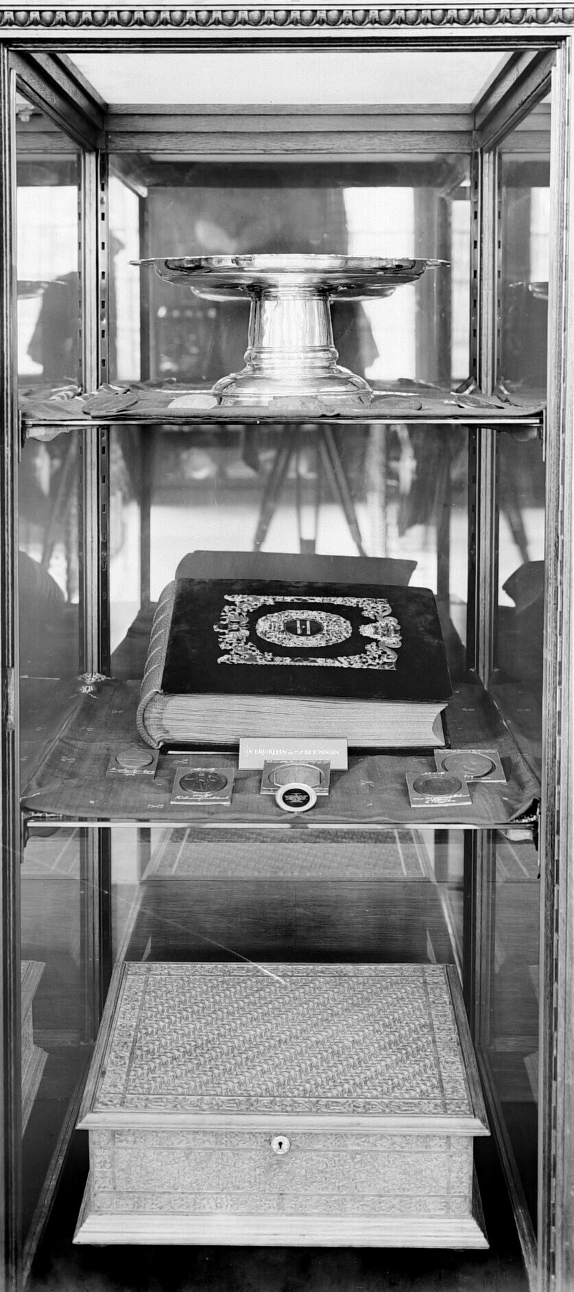 Vitrine met een fotoalbum van de sultan van Yogyakarta, aangeboden aan koningin Wilhelmina ter gelegenheid van haar 25-jarig regeringsjubileum