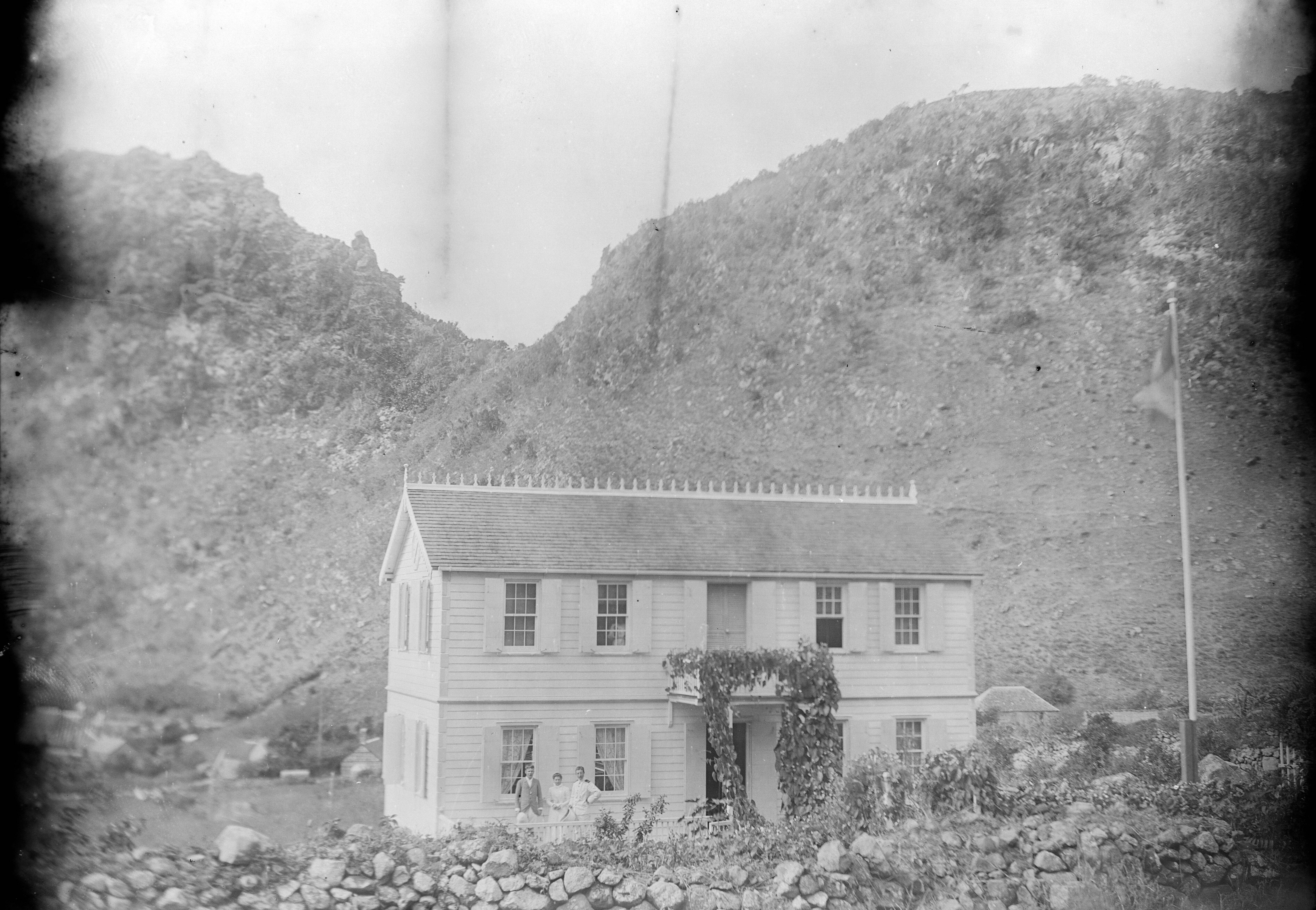 Een ambtswoning met gehezen wapperende vlag omringd door rotsen