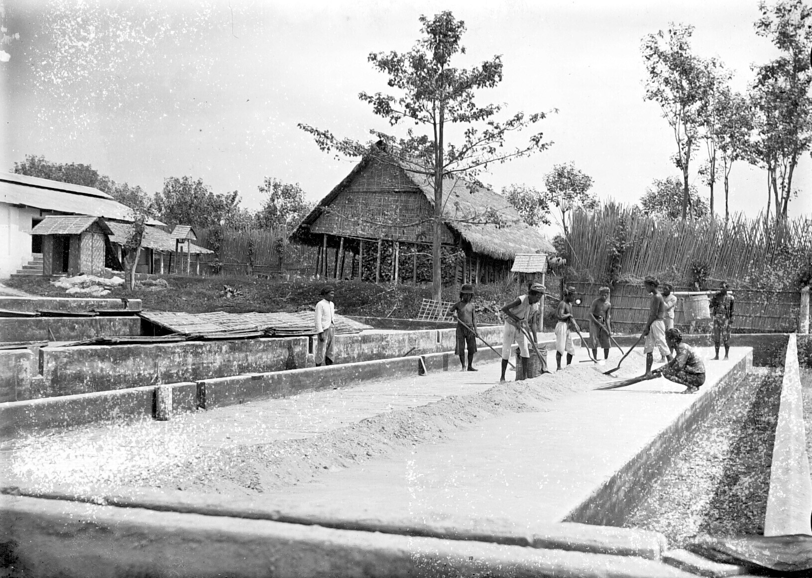 Arbeiders van een koffiefabriek tijdens het opruimen van de asregen na een uitbarsting van de vulkaan Gunung Kelud