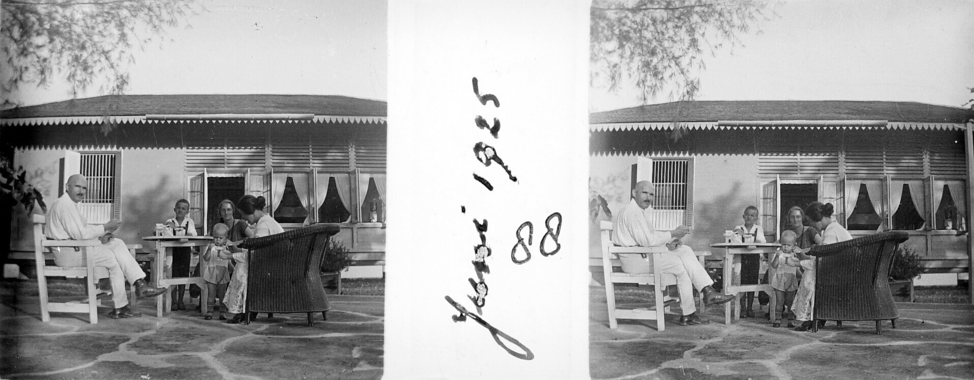 Ingenieur Bräuler, werkzaam voor het Departement van Burgerlijke Openbare Werken (BOW) in Koetaradja, met zijn vrouw en zoon op bezoek bij houtvester C.H. Japing en zijn gezin in Olehleh