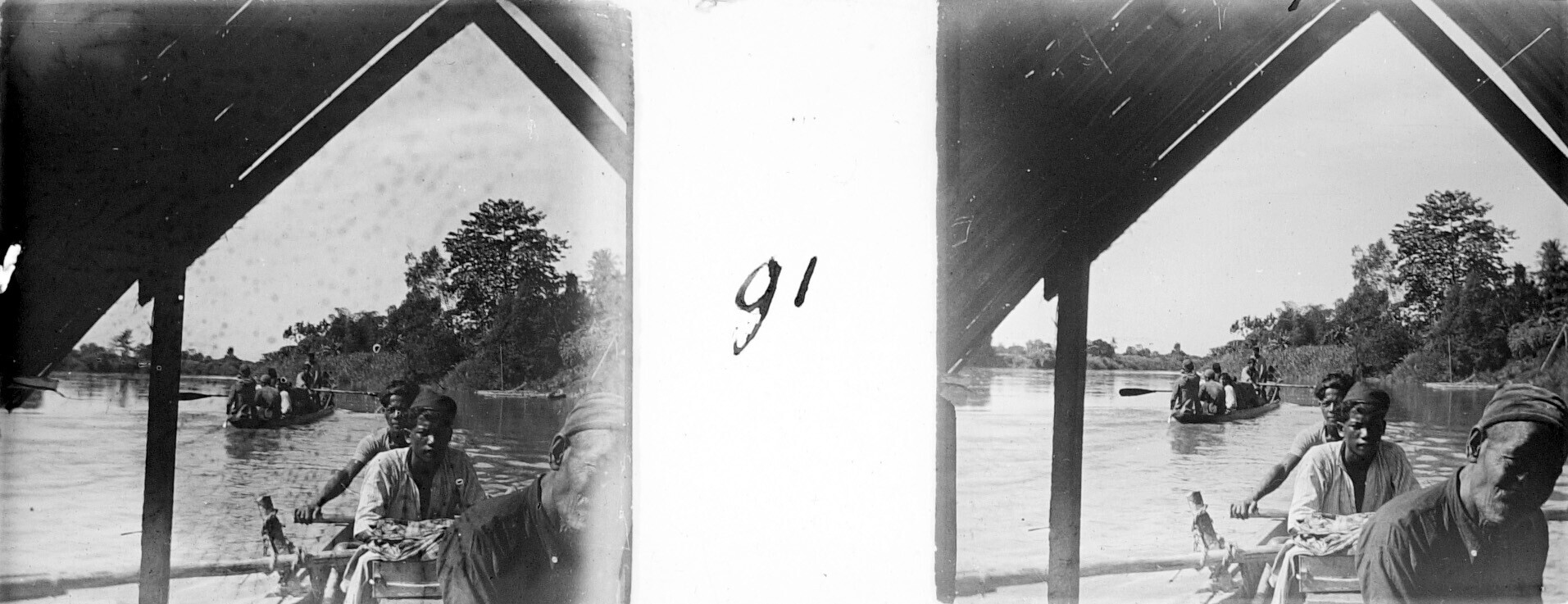 Prauwen op de rivier op weg naar een bivak van het Boschwezen (?), Atjeh