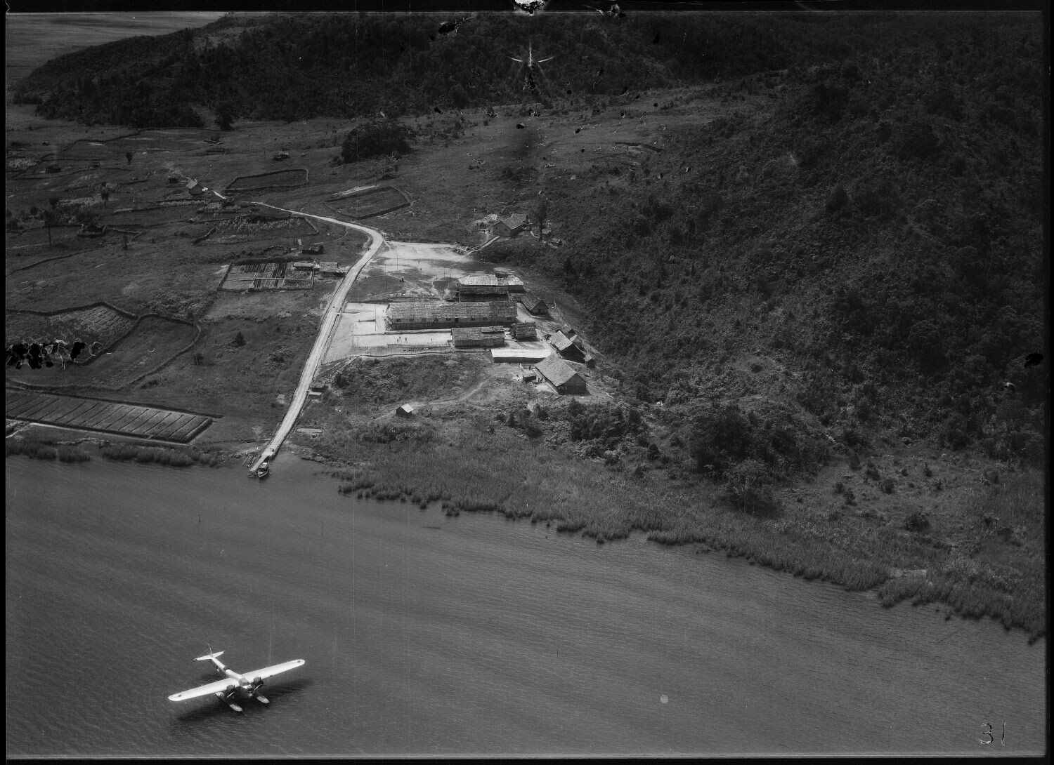 Air photo of the mountainous terrain with a Fokker T-IV aircraft landed on Lake Paniai, one of the three Wissel Lakes, at the Enarotali bivouac in Central New Guinea