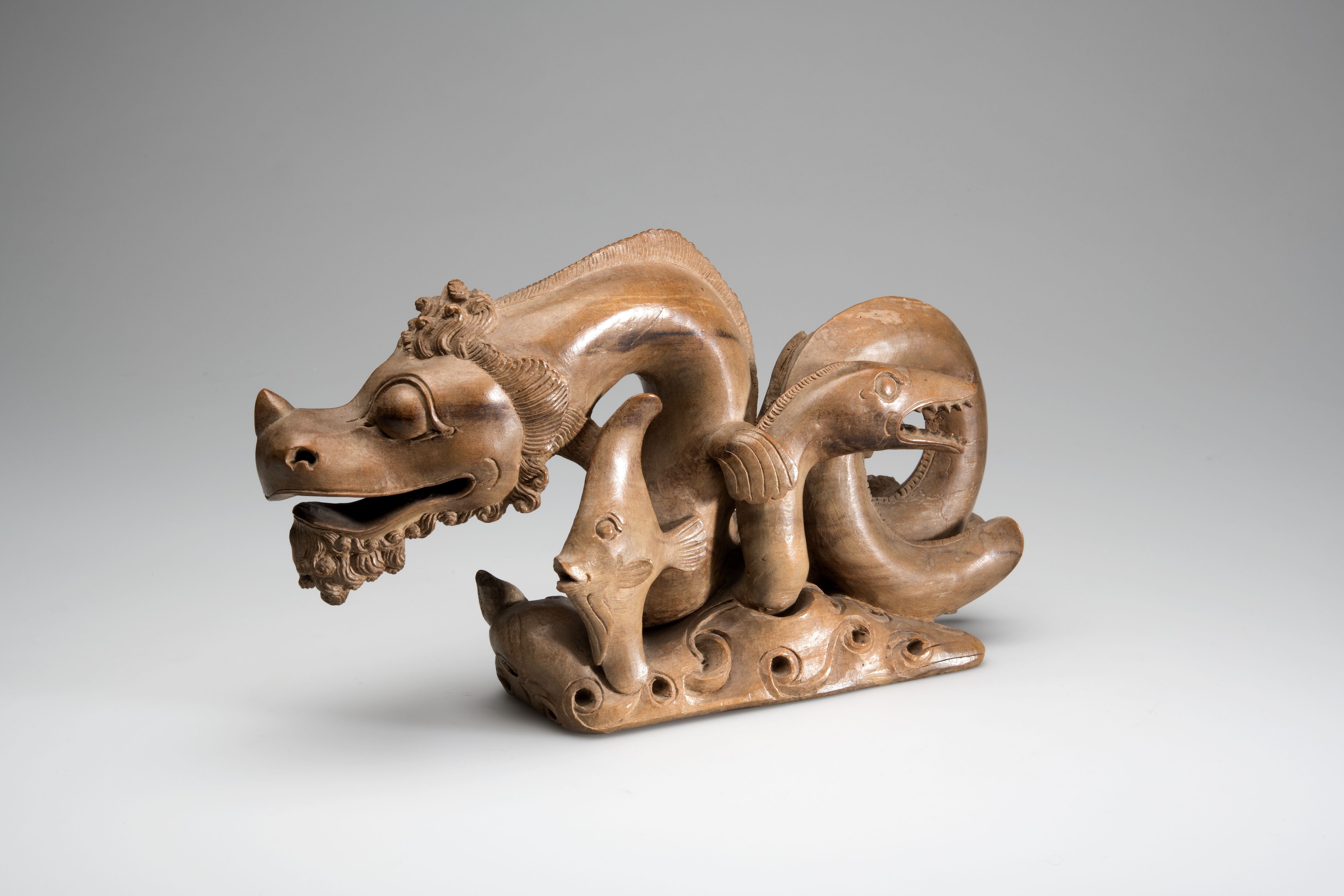 Houten beeld van een kronkelende zeeslang met een maanvis