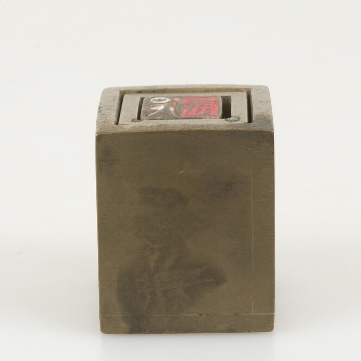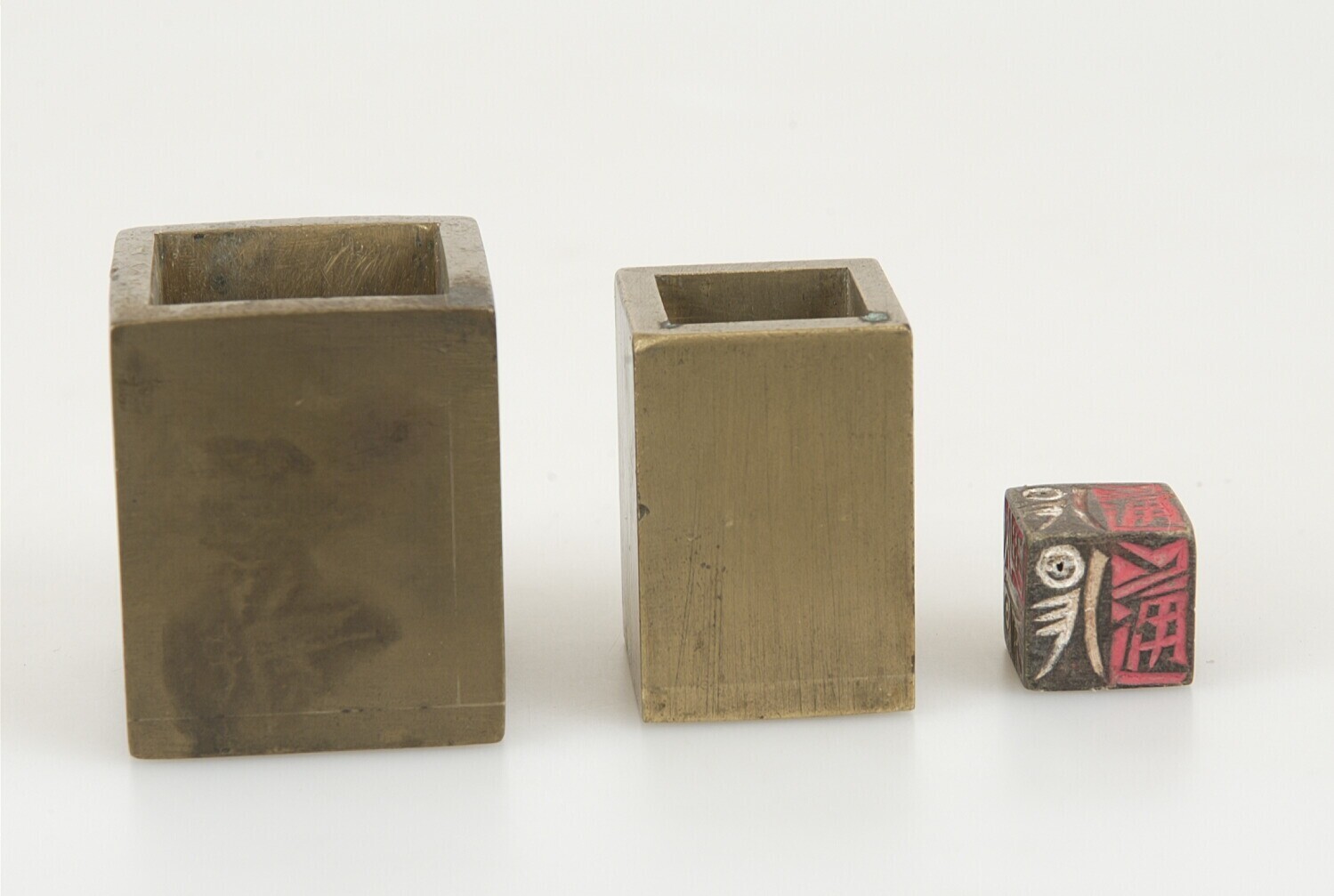 Twee in elkaar passende messingen houders met houten dobbelsteen voor het Chinese Lien-po spel