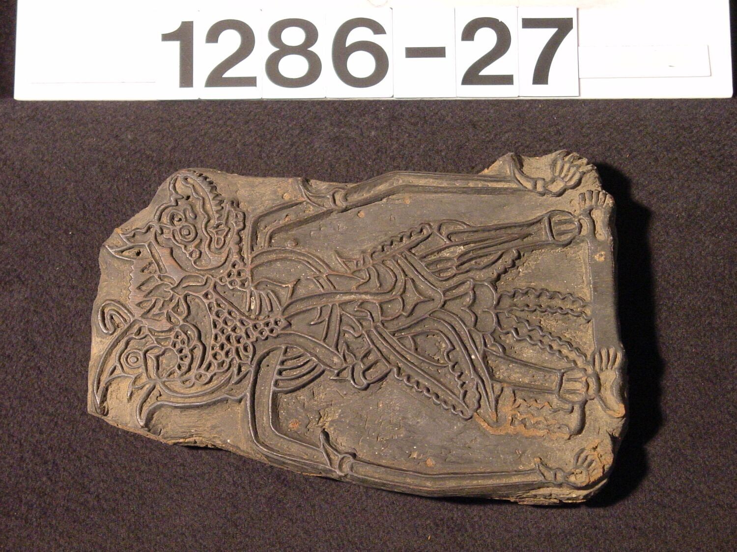 Houten cliché voor het drukken van een wajangfiguur op textiel