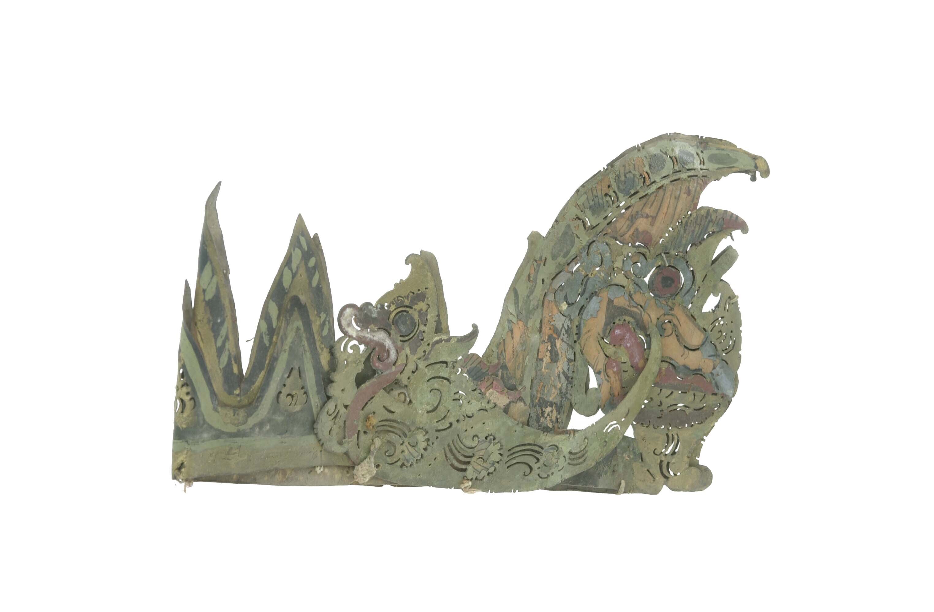 Diadeem van opengewerkt verguld leer, behoort tot de kleding van een wayang wongspeler