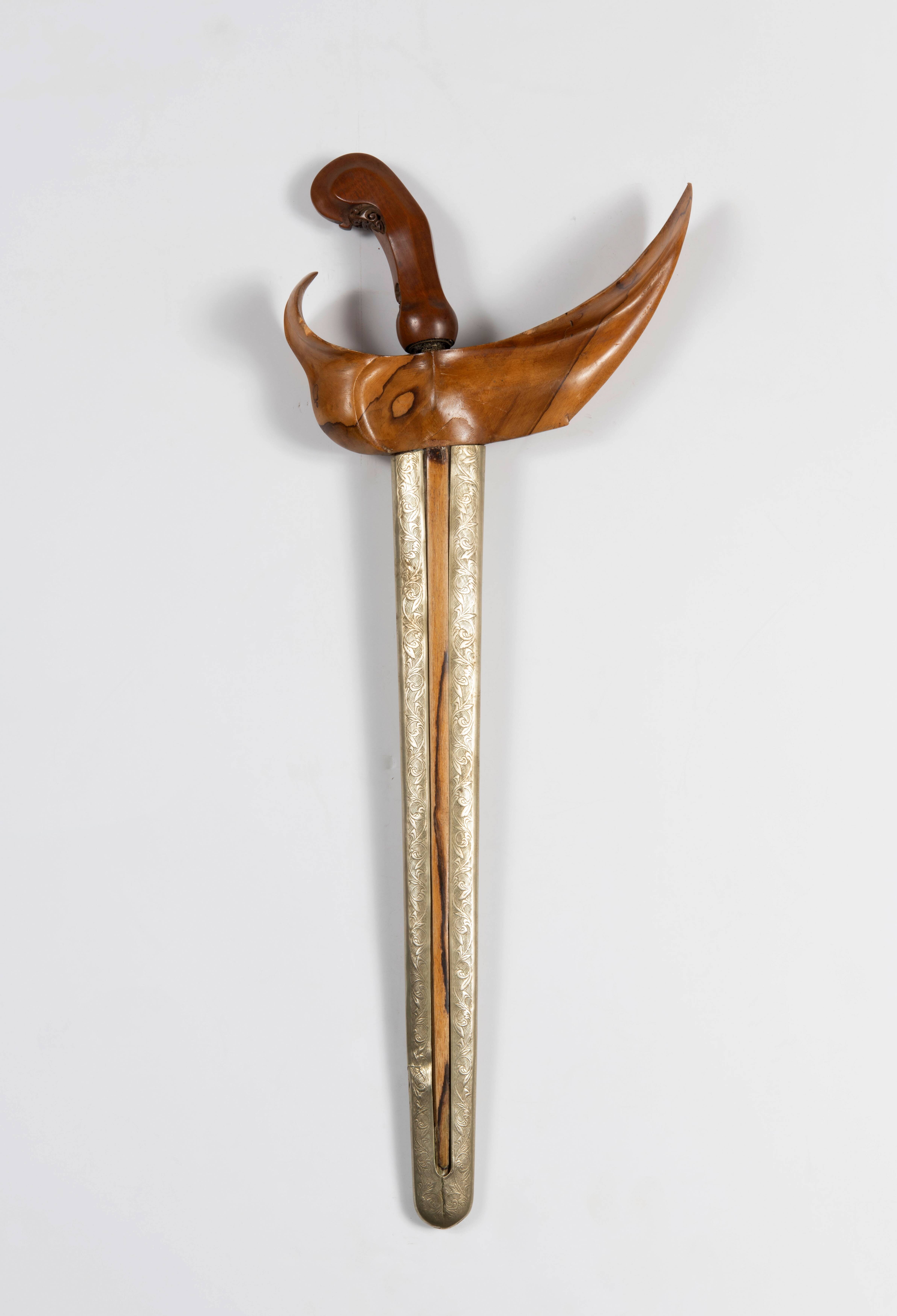 Gegolfde kris met houten greep en houten schede met witmetalen overschede