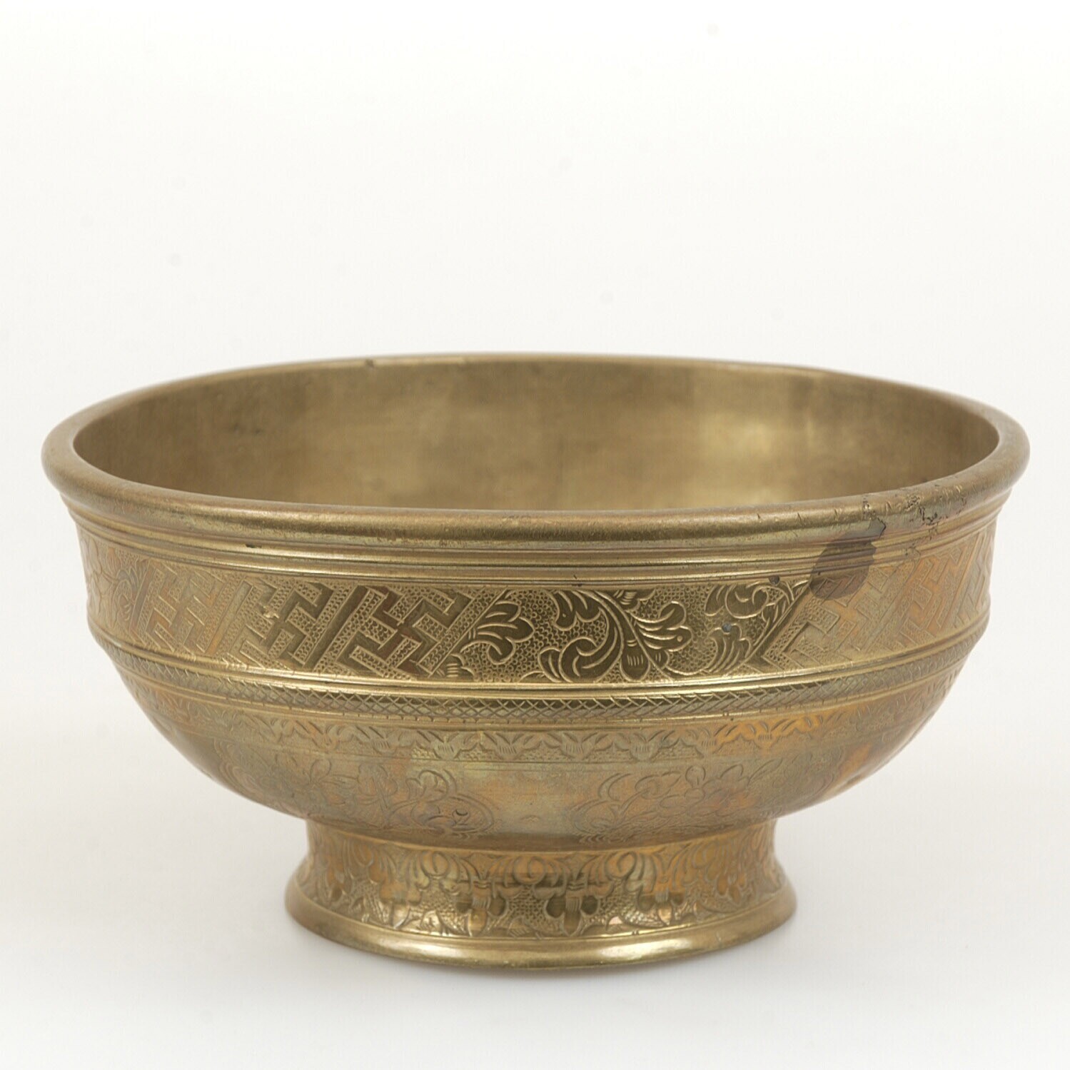 Waskom van messing met gedreven blad- , bloem- en swastikamotieven