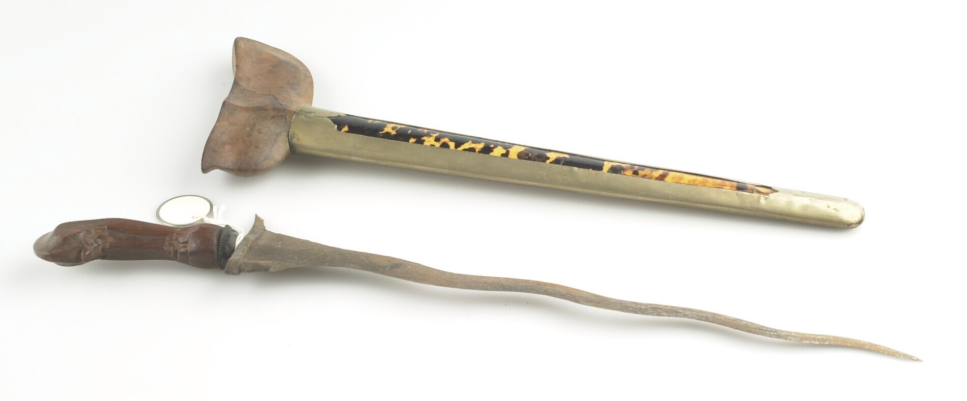 Gegolfde kris met houten greep en houten schede met metalen overtrek