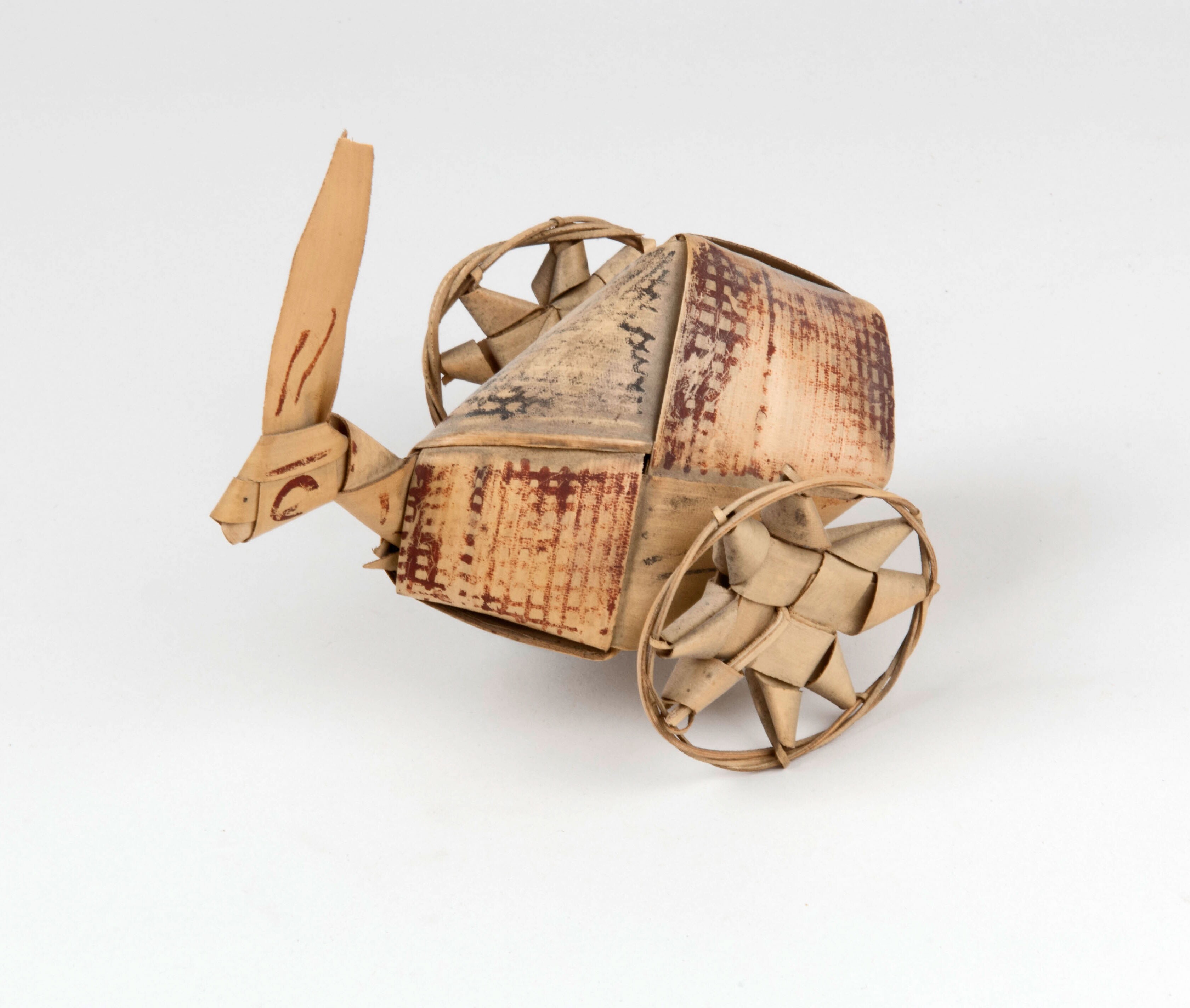Kinderspeelgoed kwartel op wielen van gevlochten lontarblad