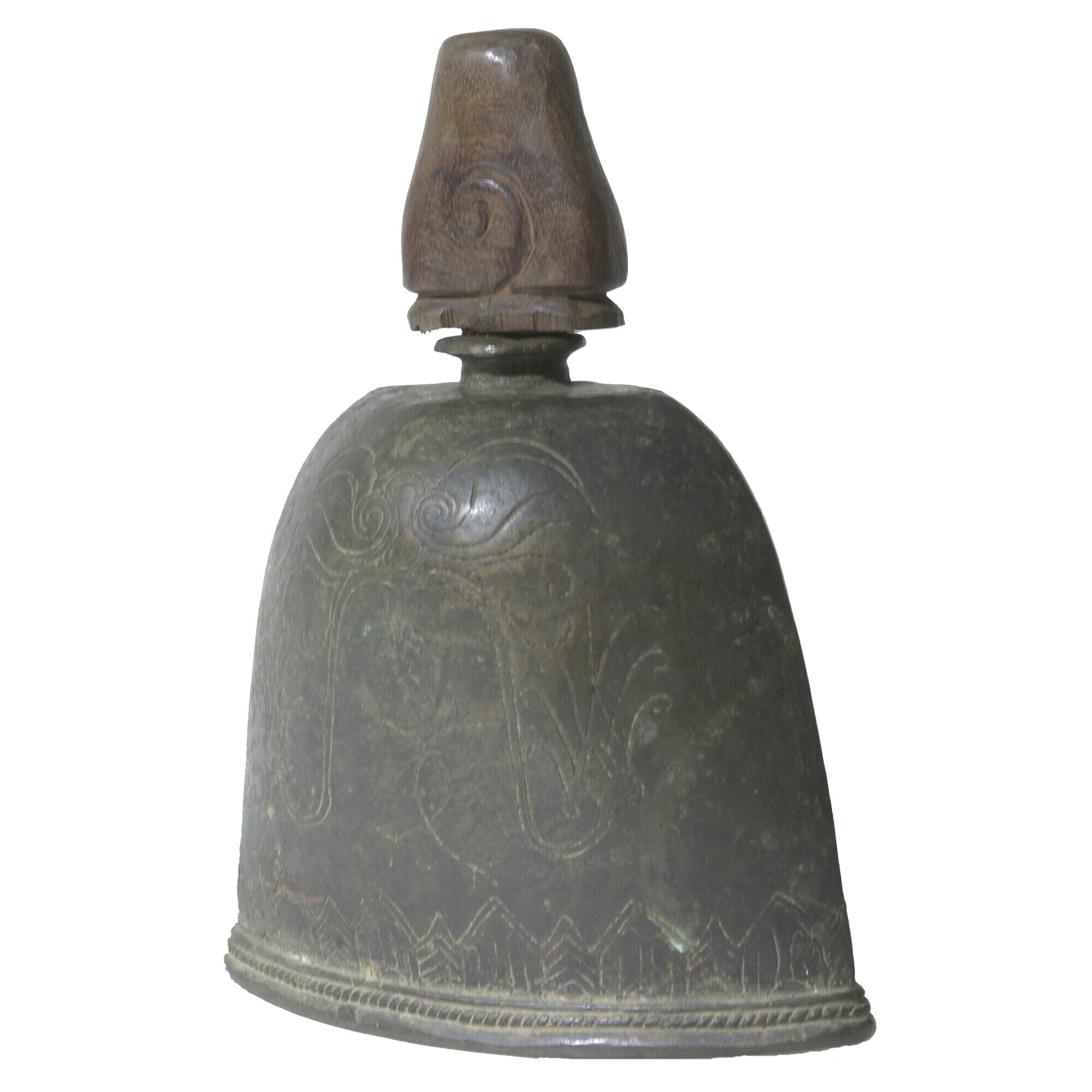 Koperen veebel met houten stop en ingekraste versiering