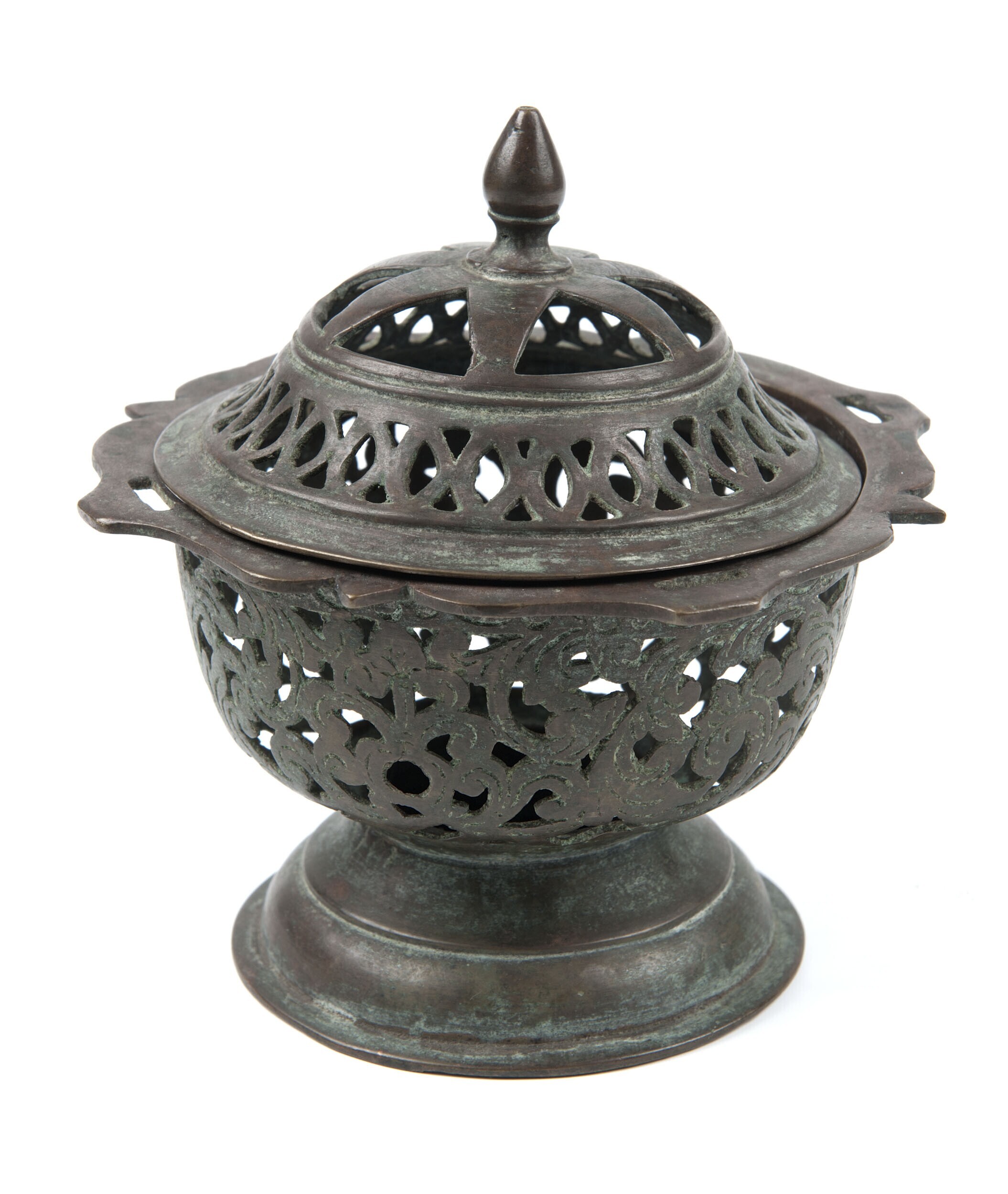 Opengewerkte metalen bak op voet, vermoedelijk wierookbrander