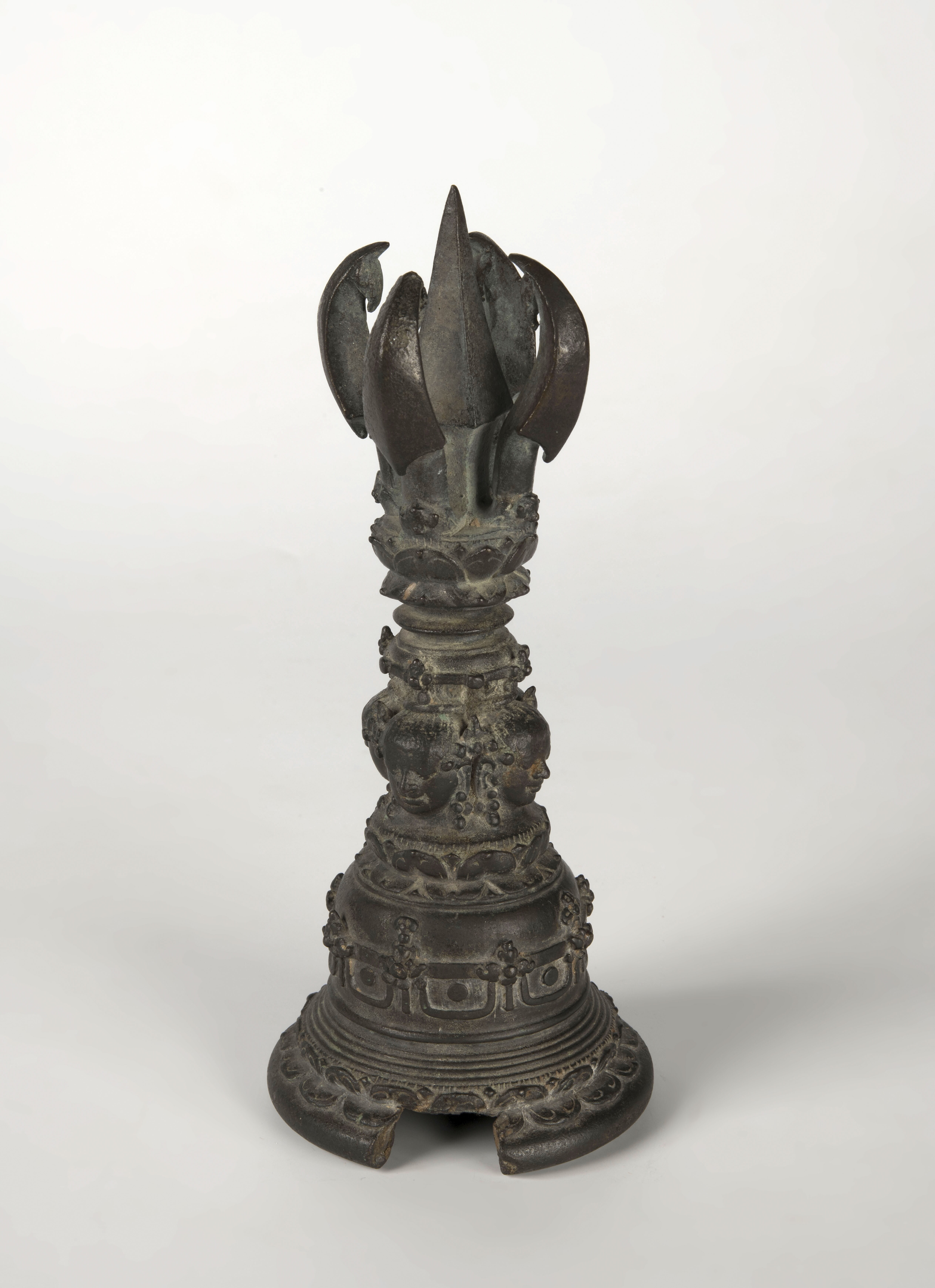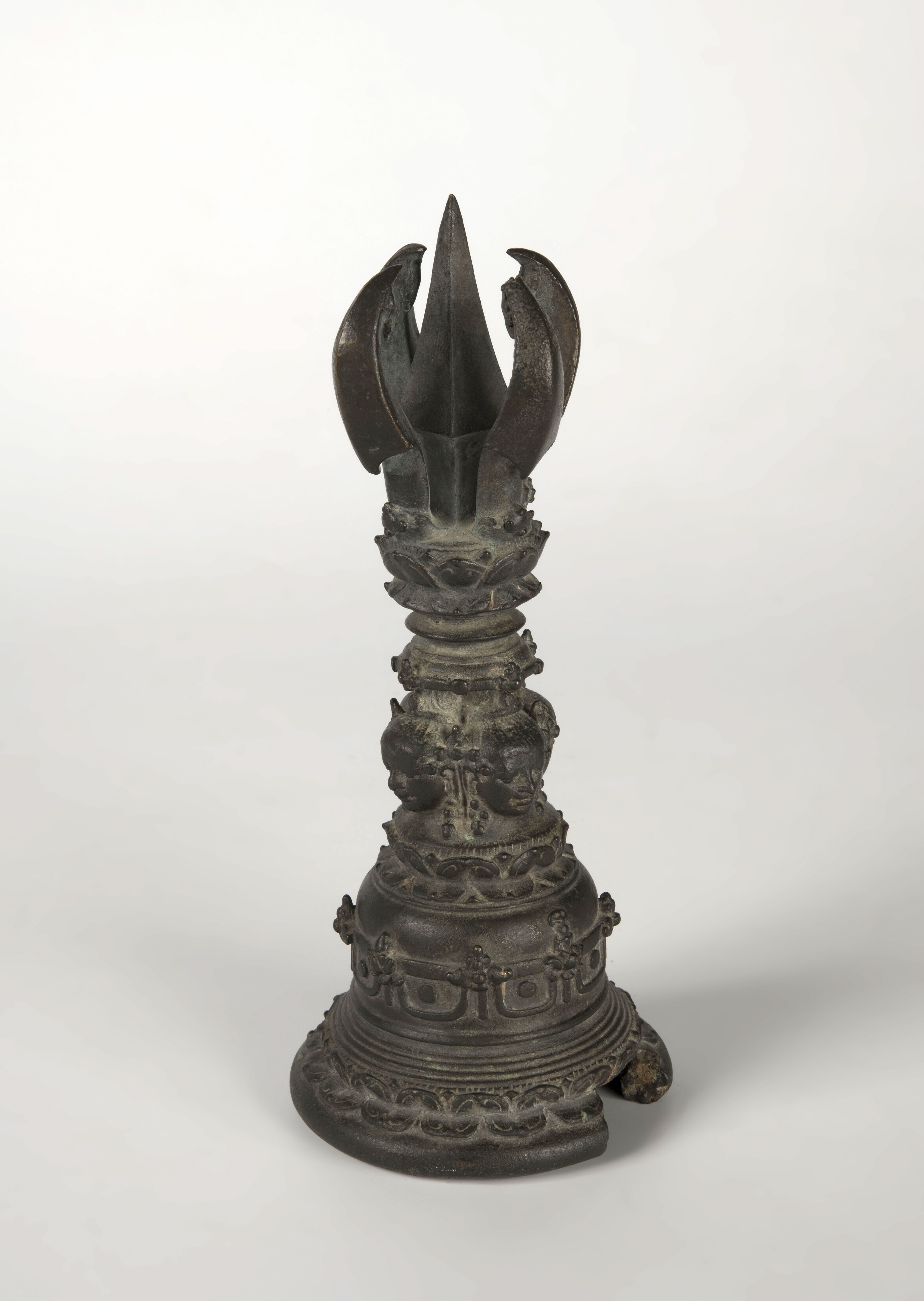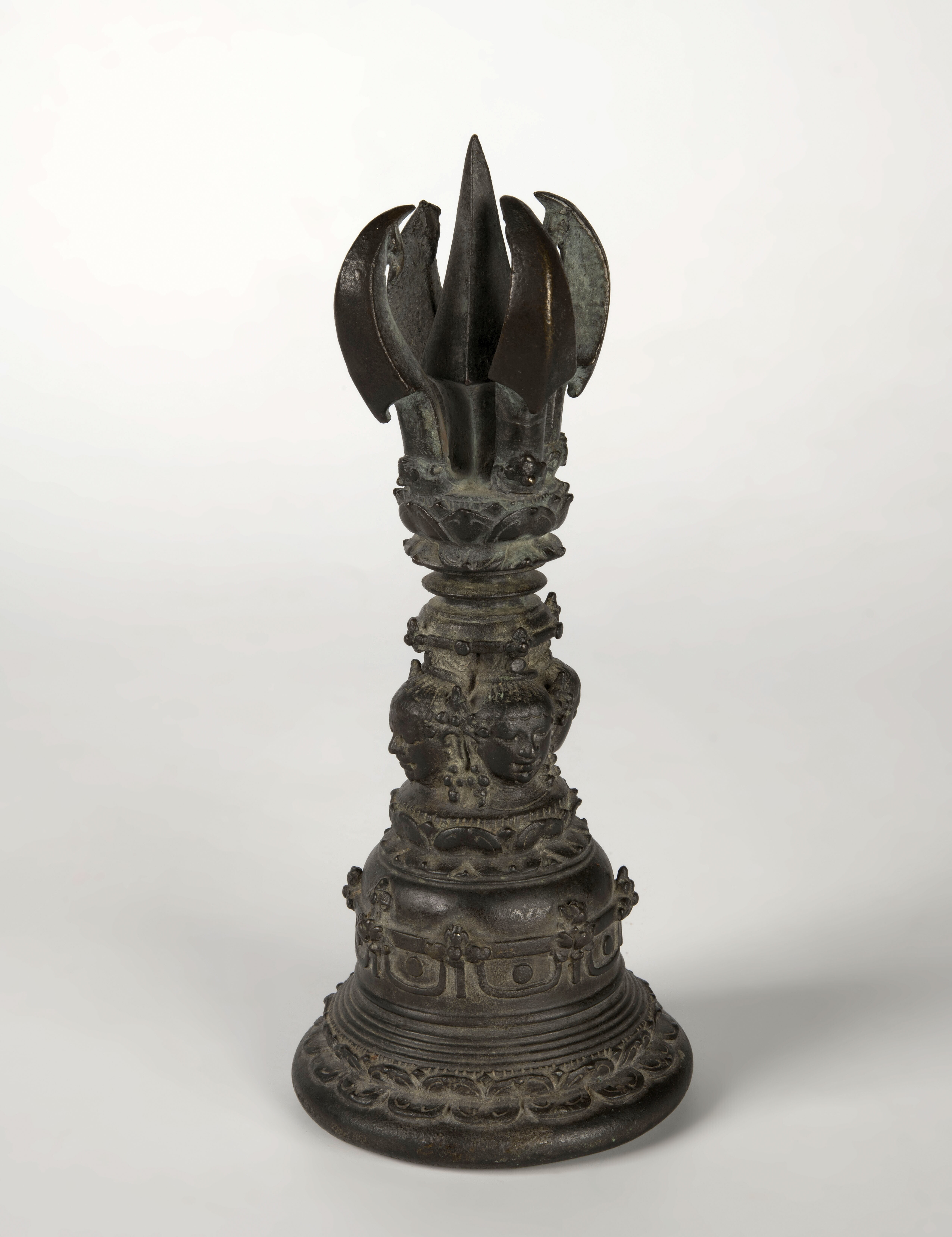 Bronzen priesterbel met de hoofden van vier Dhyani Boeddhas