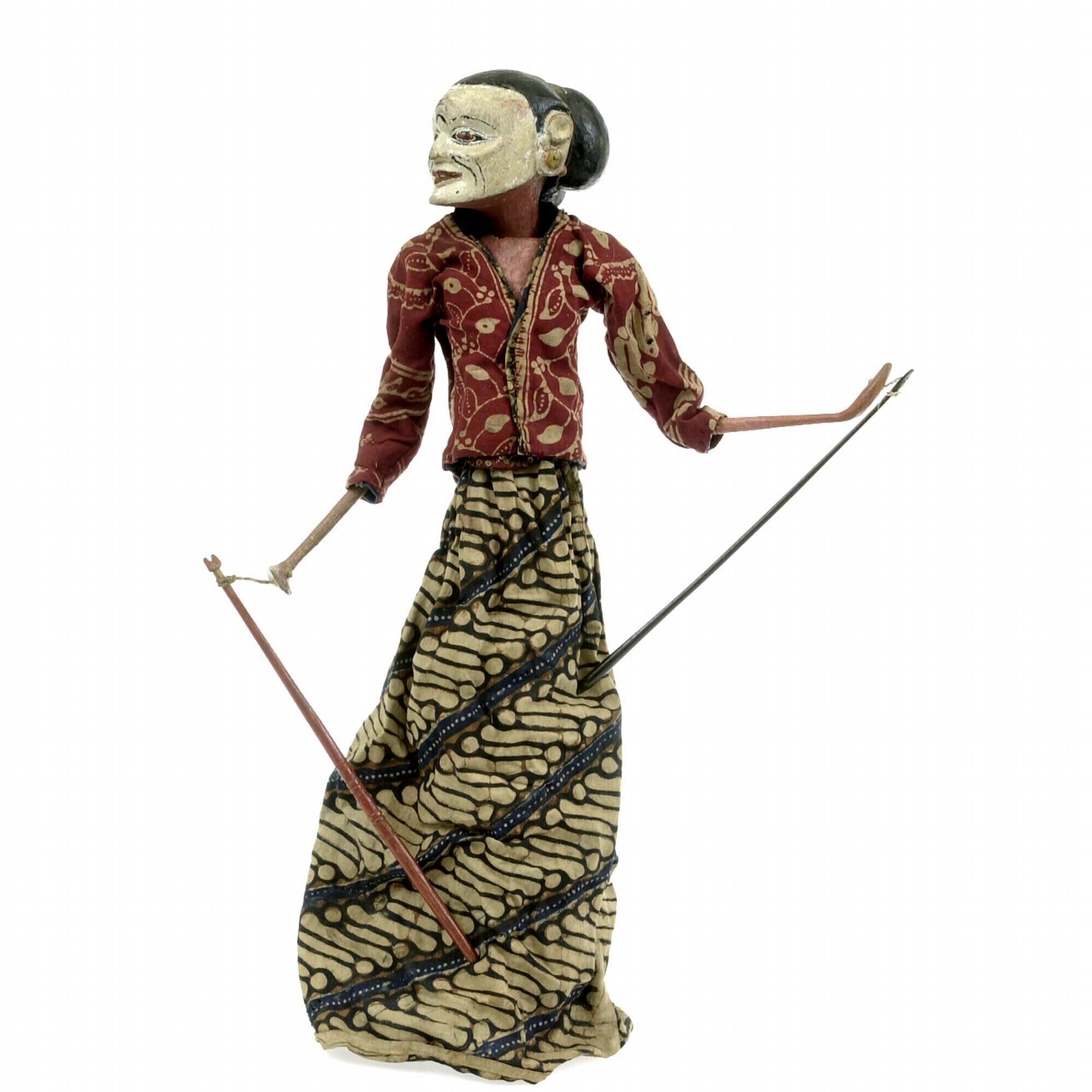 Wajangpop van hout, vermoedelijk de vrouwelijke bediende Inang Inang Pangasu voorstellend