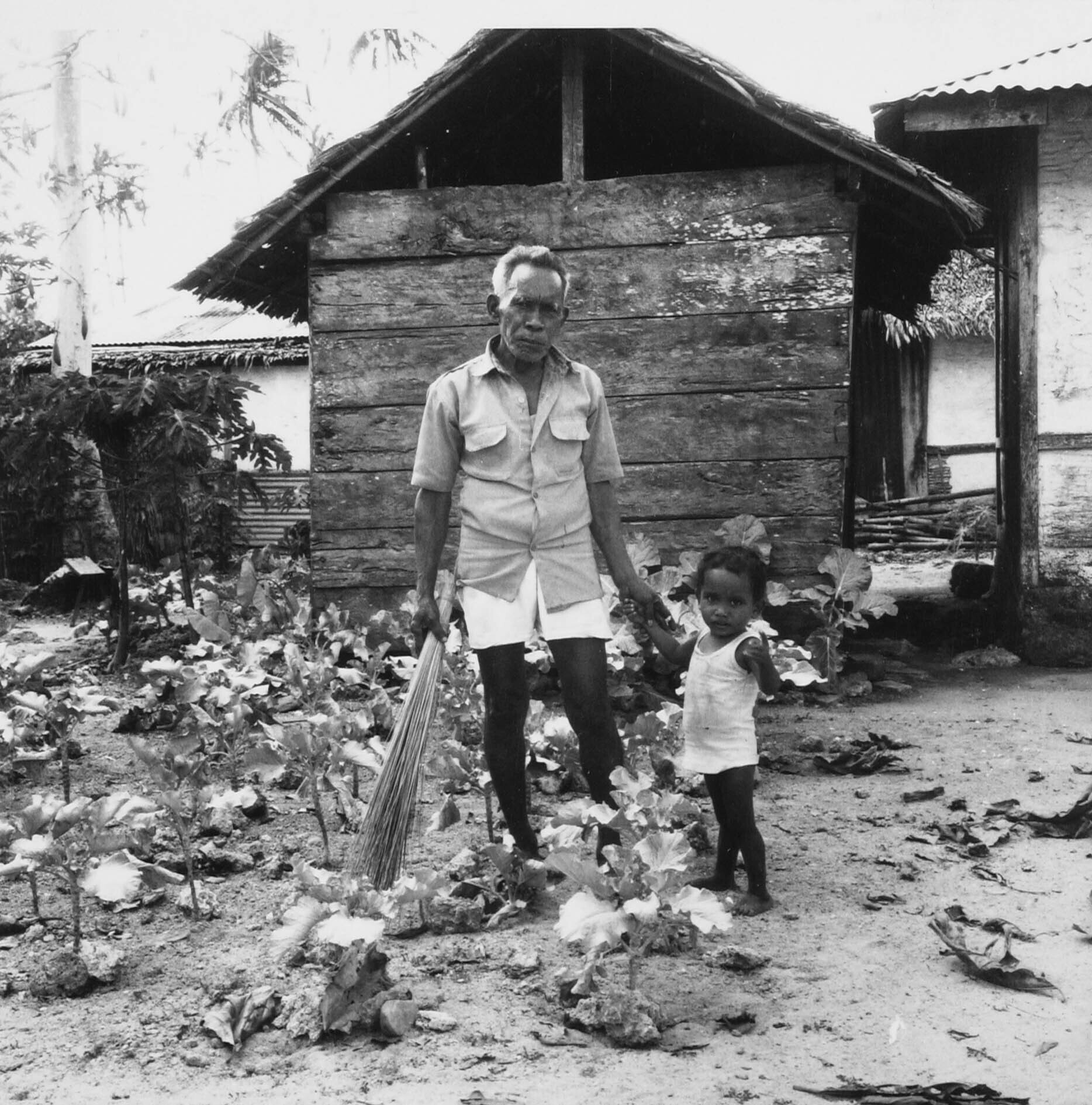 Grootvader met zijn kleindochter in de groentetuin met koolaanplant in het dorp Ngilngof