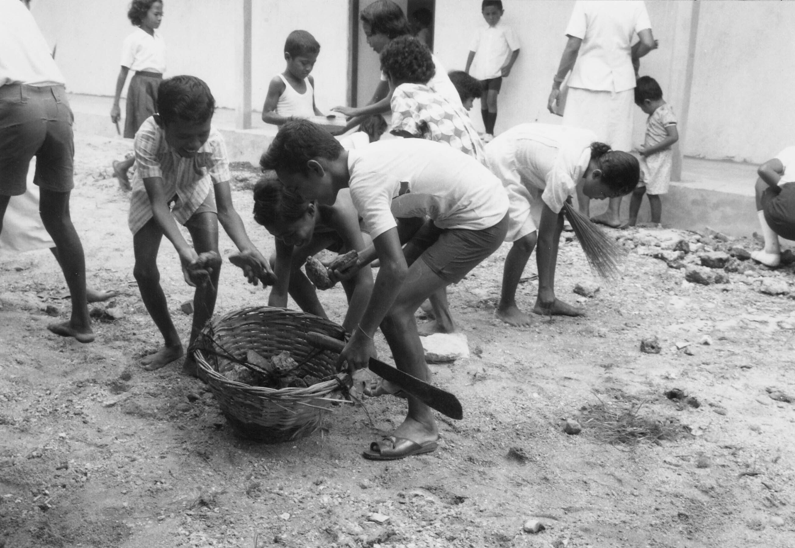 Een zwartwitfoto van enkele schoolkinderen, die het schoolerf opruimen van de nieuwe school in het dorp Ullath op het eiland Saparua, Molukken.