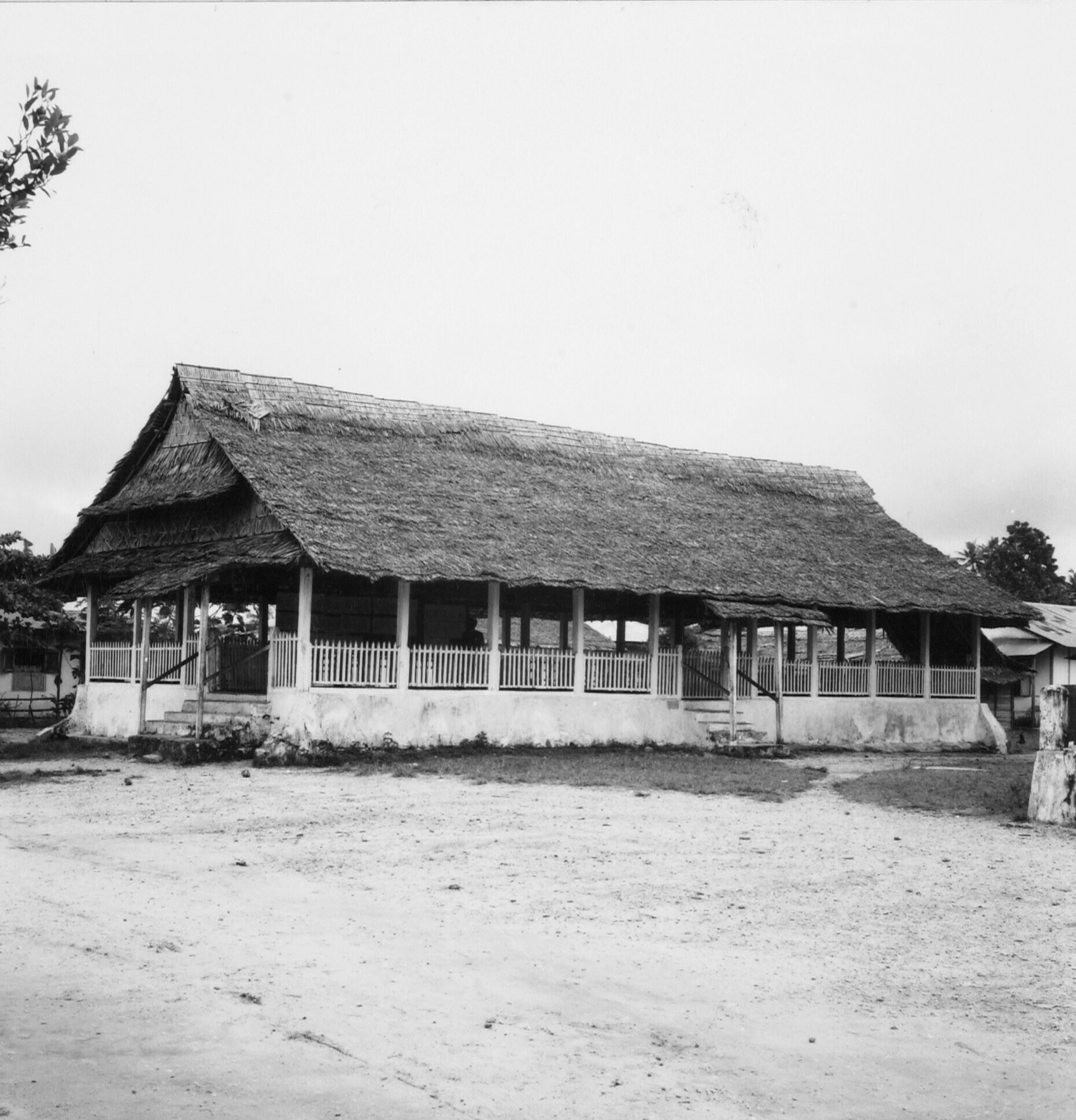 Een zwartwitfoto van het Raadhuis in het dorp Ullath op het eiland Saparua, Molukken.