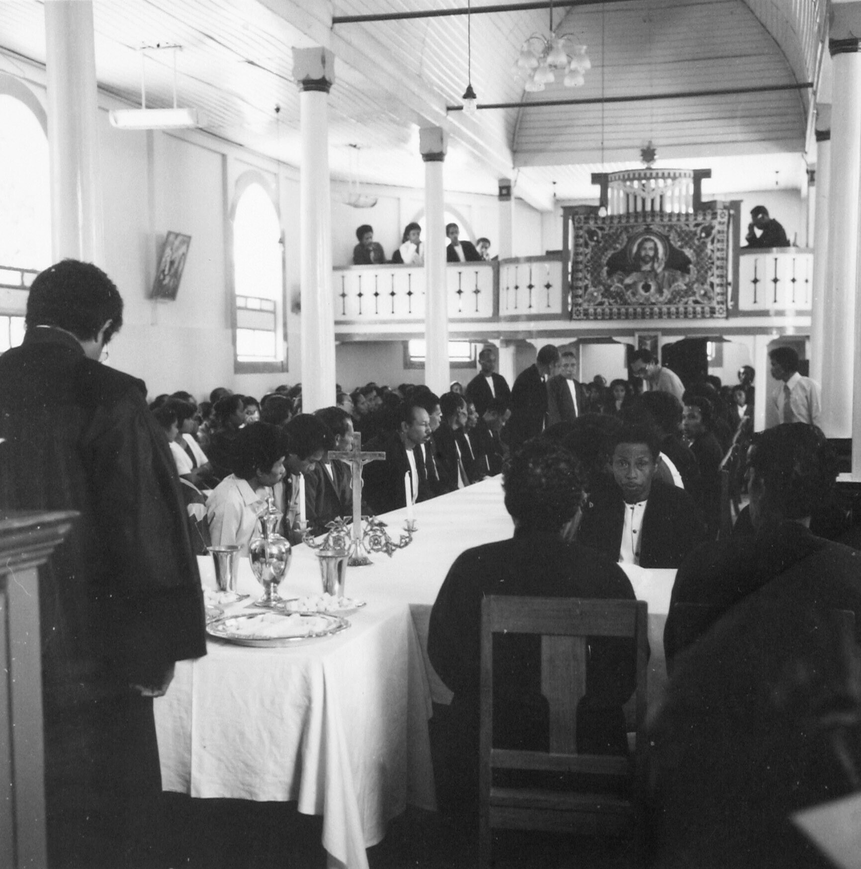 Mensen zitten aan tafel voor het avondmaal in de protestantse kerk te Soya