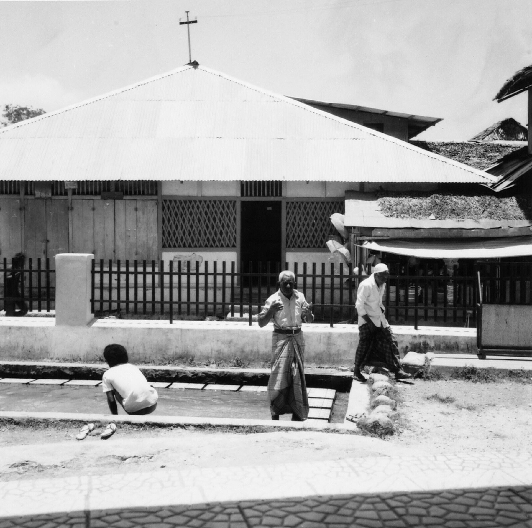 Een man tijdens zijn rituele wassing op vrijdagochtend in de vijver voor de moskee te Tulehu