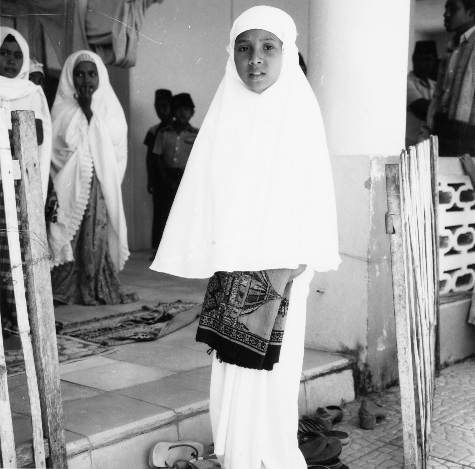 Portret van een meisje met een bidkleed voor de moskee te Tulehu