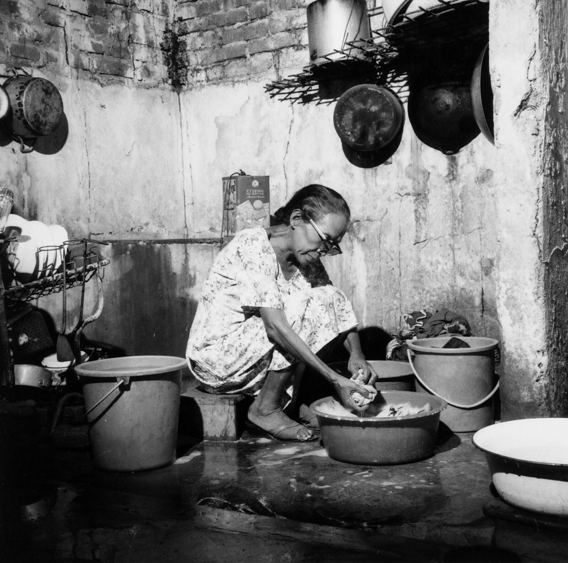 Een vrouw wast kleding in het washok in haar woning