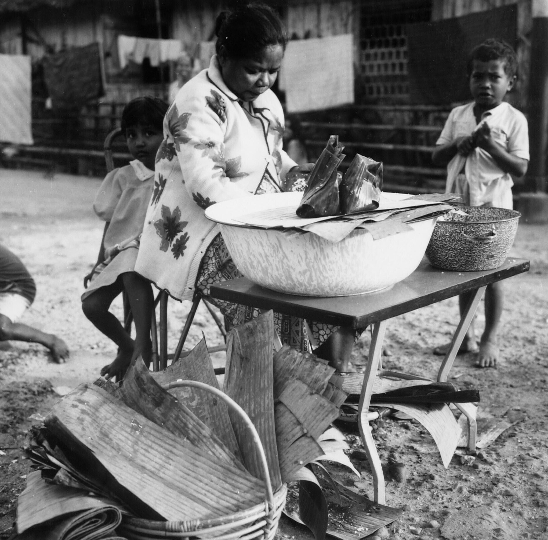 Een vrouw verkoopt in bananenblad verpakte nasi ketan te Tulehu