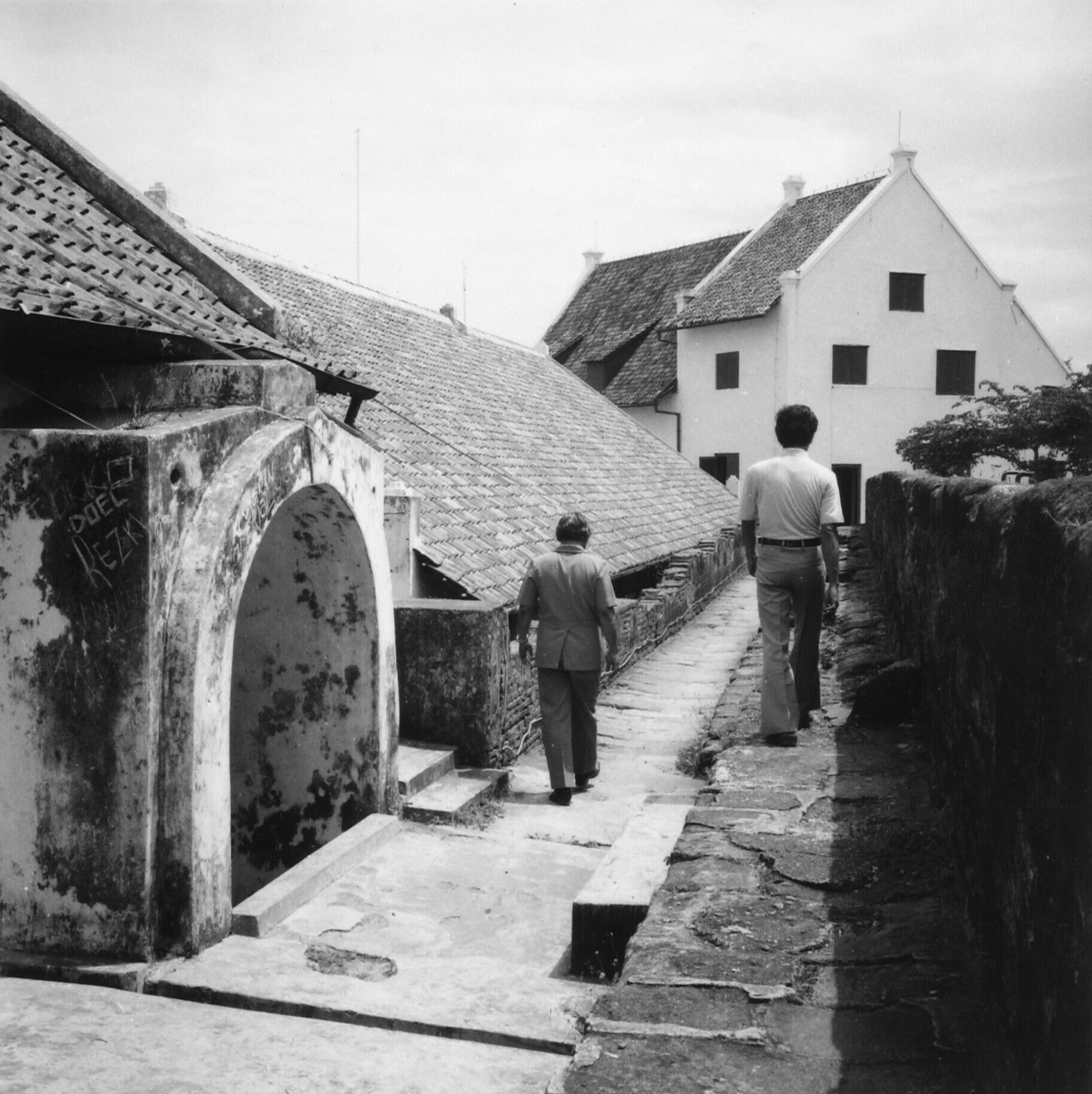 Twee mannen lopen langs de borstwering van Fort Rotterdam