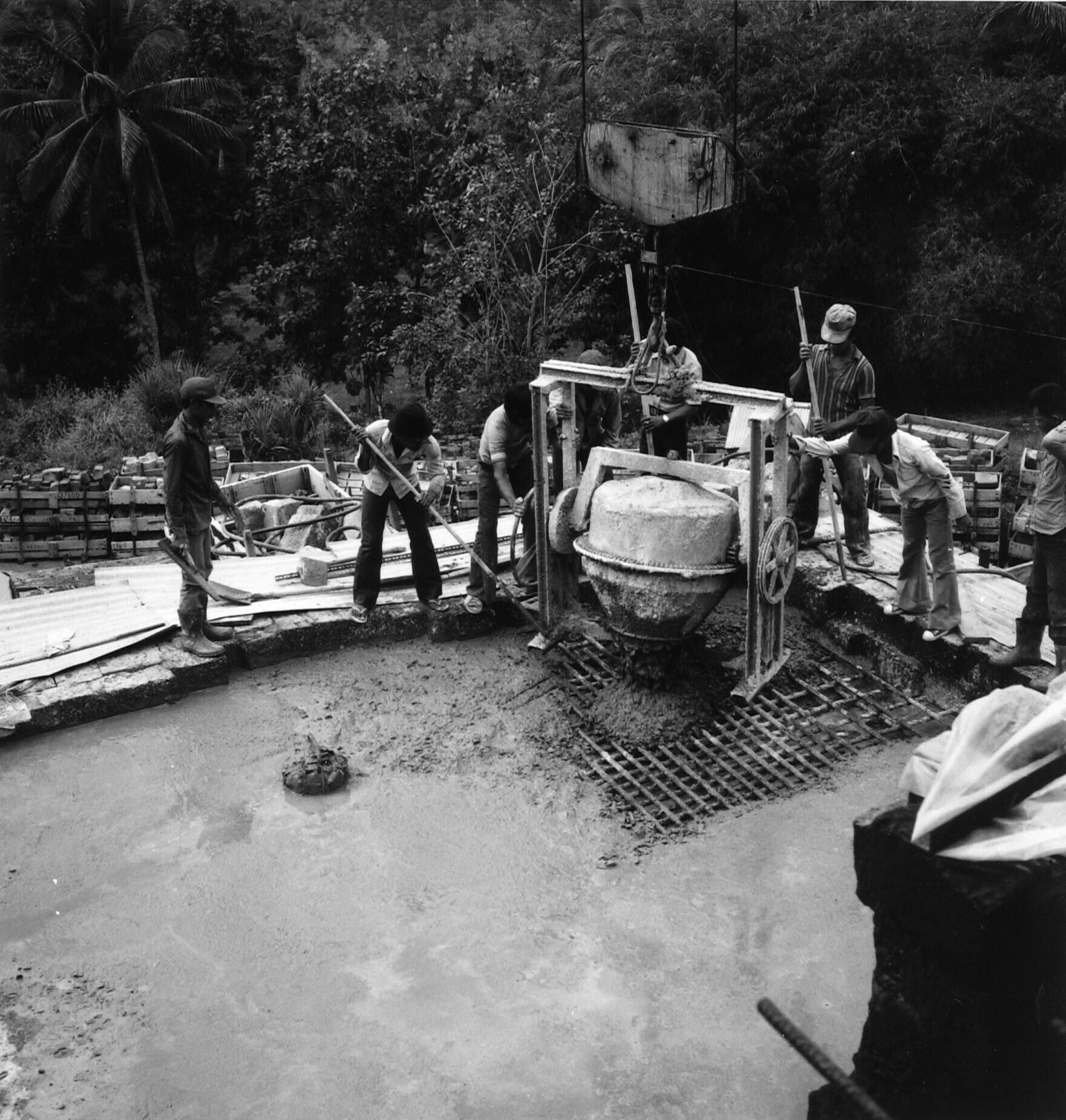 Arbeiders storten beton op één van de gaanderijen ten behoeve van de restauratie van de Borobudur
