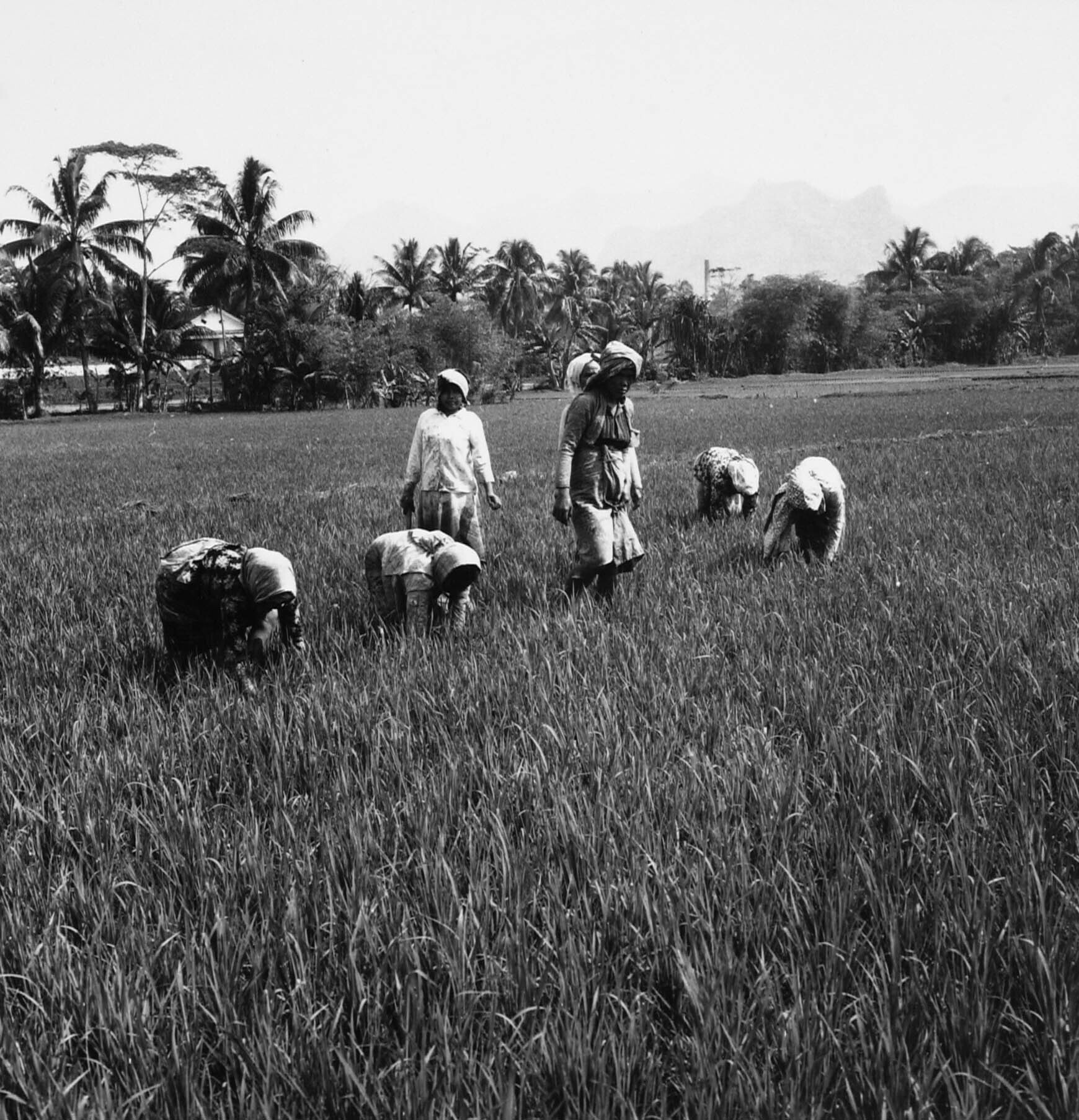 Vrouwen wieden het onkruid tussen de rijstplanten