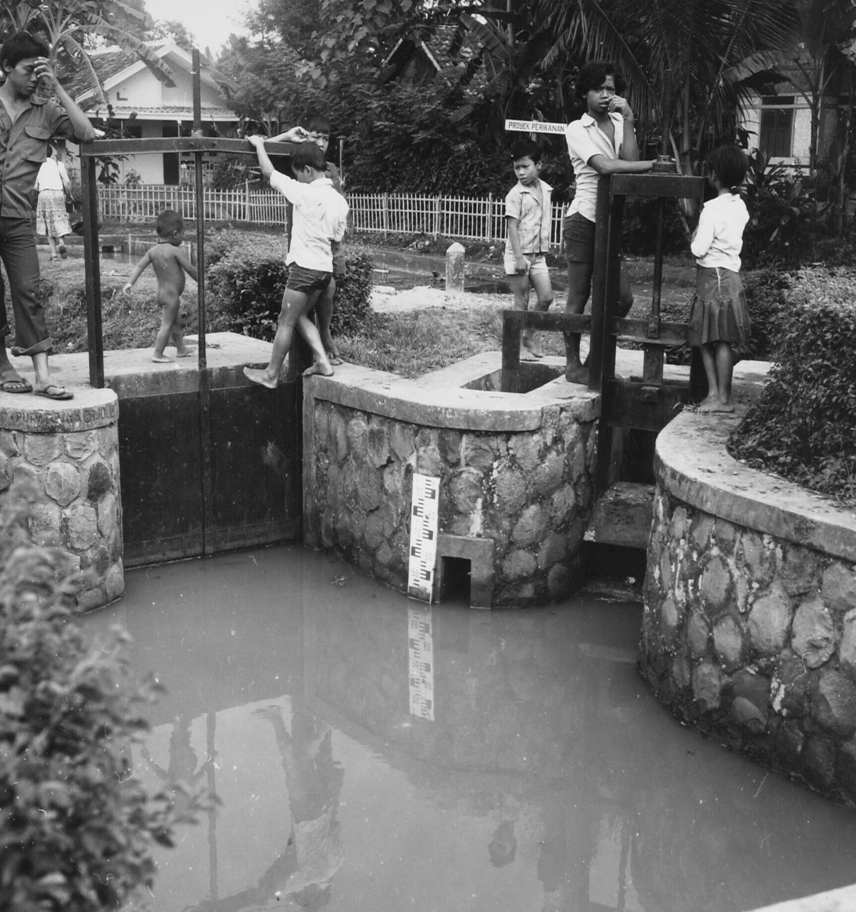 Kinderen spelen bij een verdeelpunt in een irrigatiekanaal