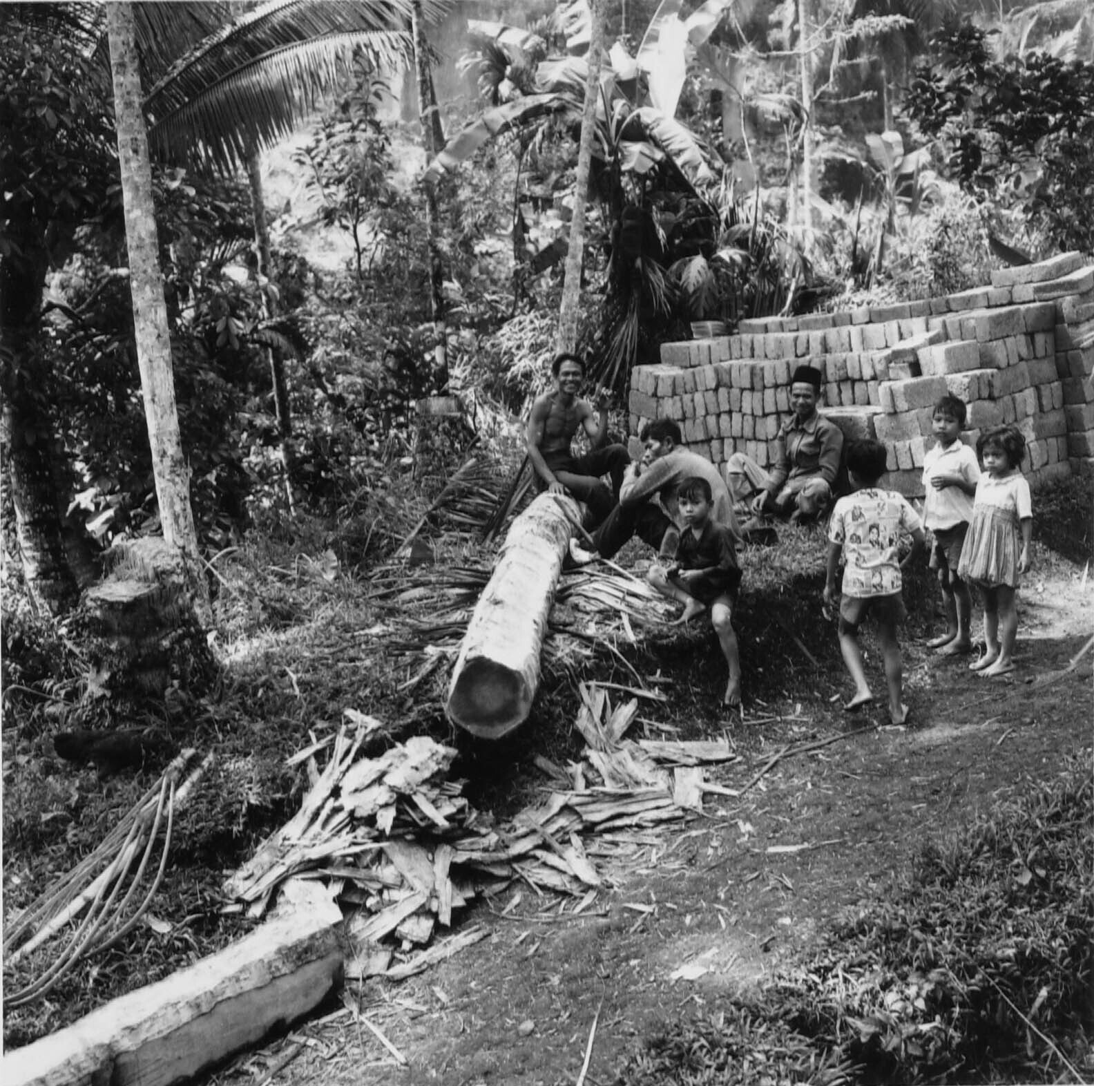 Een groepje mannen en kinderen bij een partij bakstenen en een gevelde palm