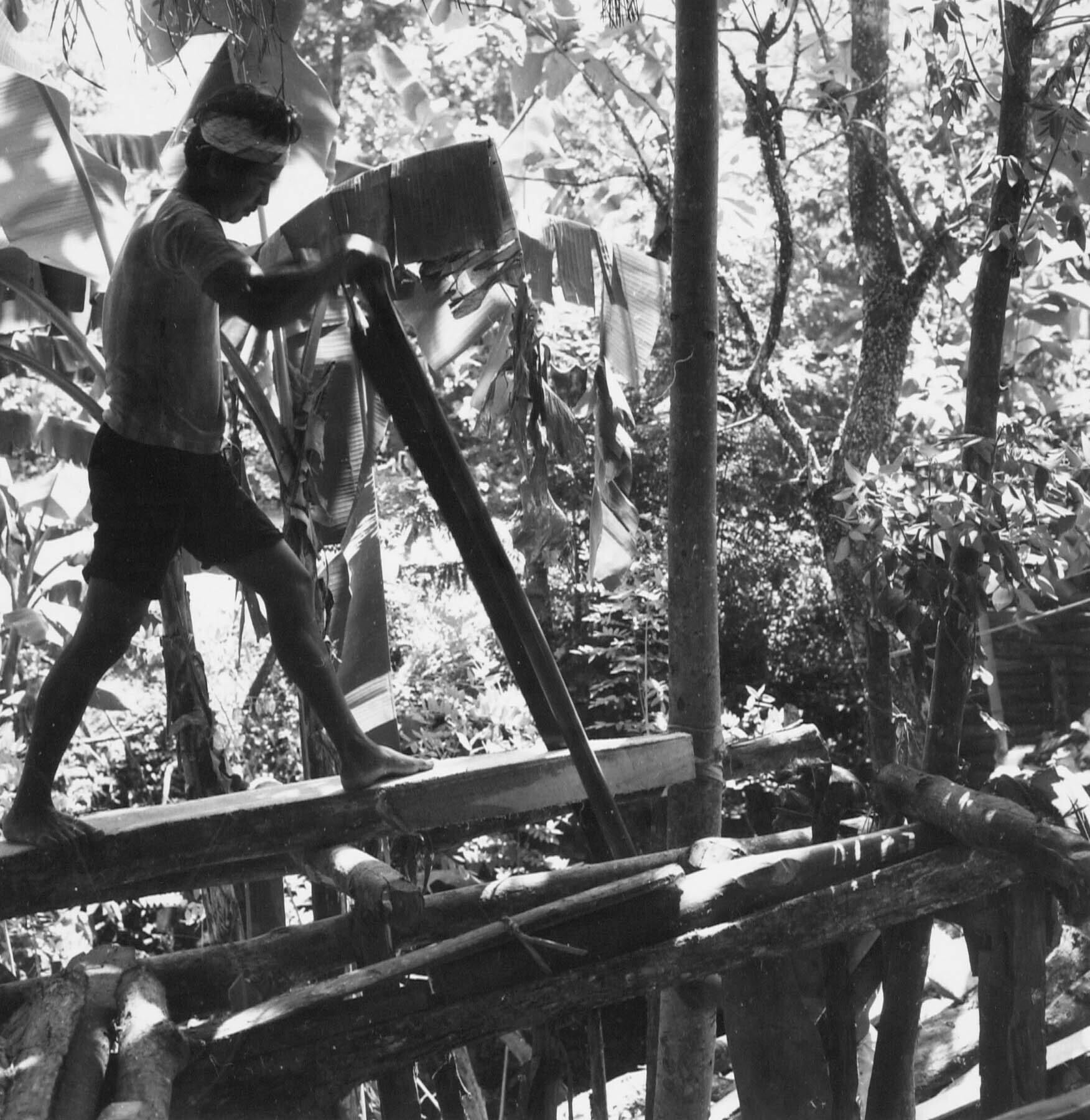 Het zagen van hout voor de bouw van boten die zand uit de rivier vervoeren