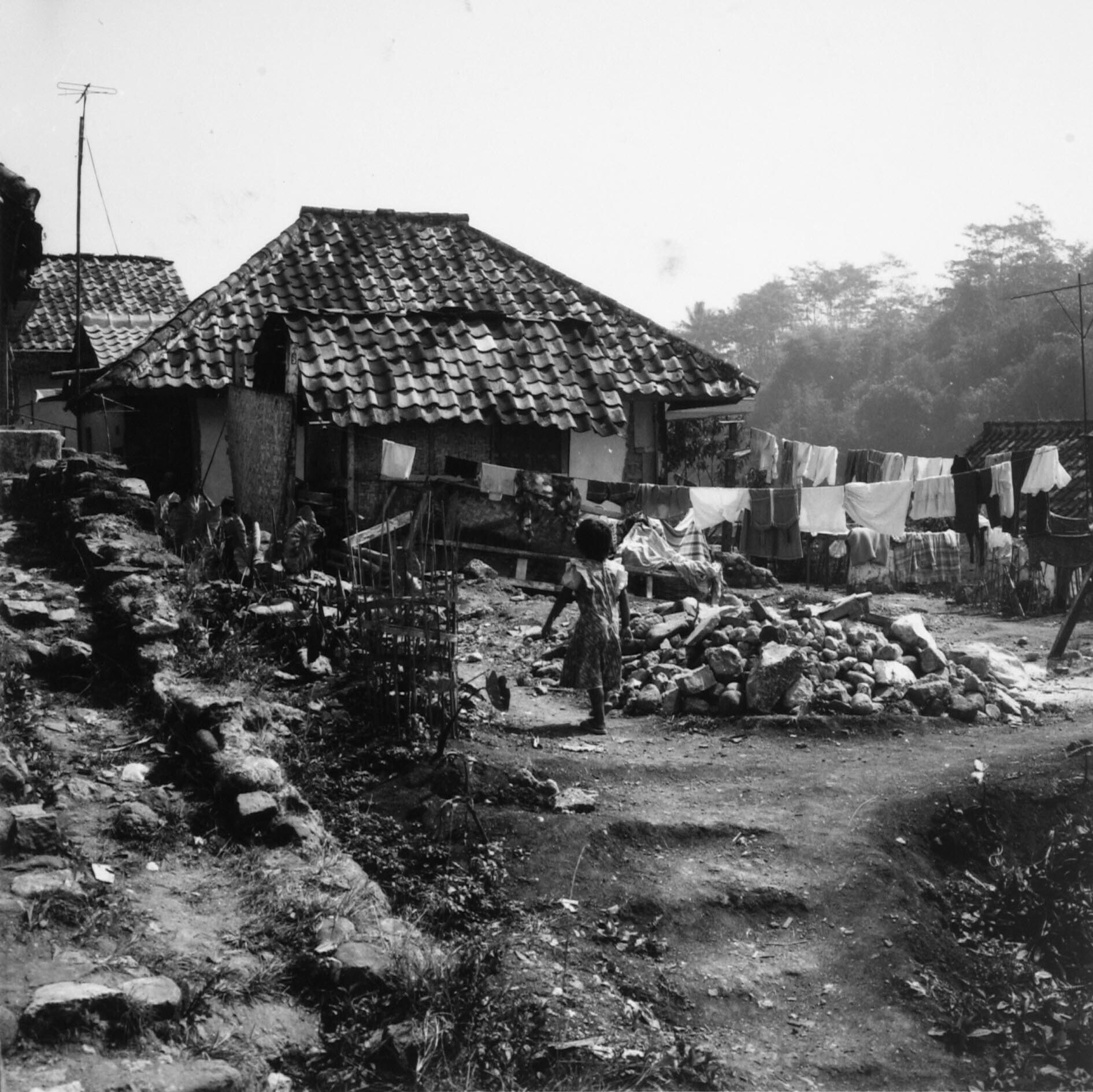 Woonhuis met erf waarop wasgoed aan de lijn hangt te drogen